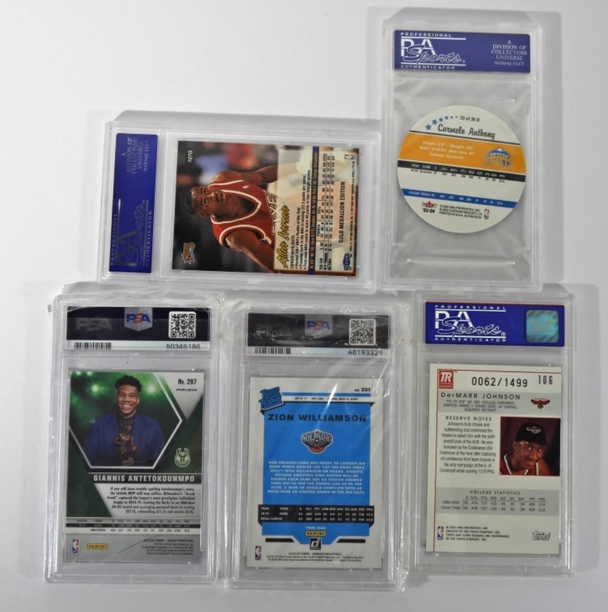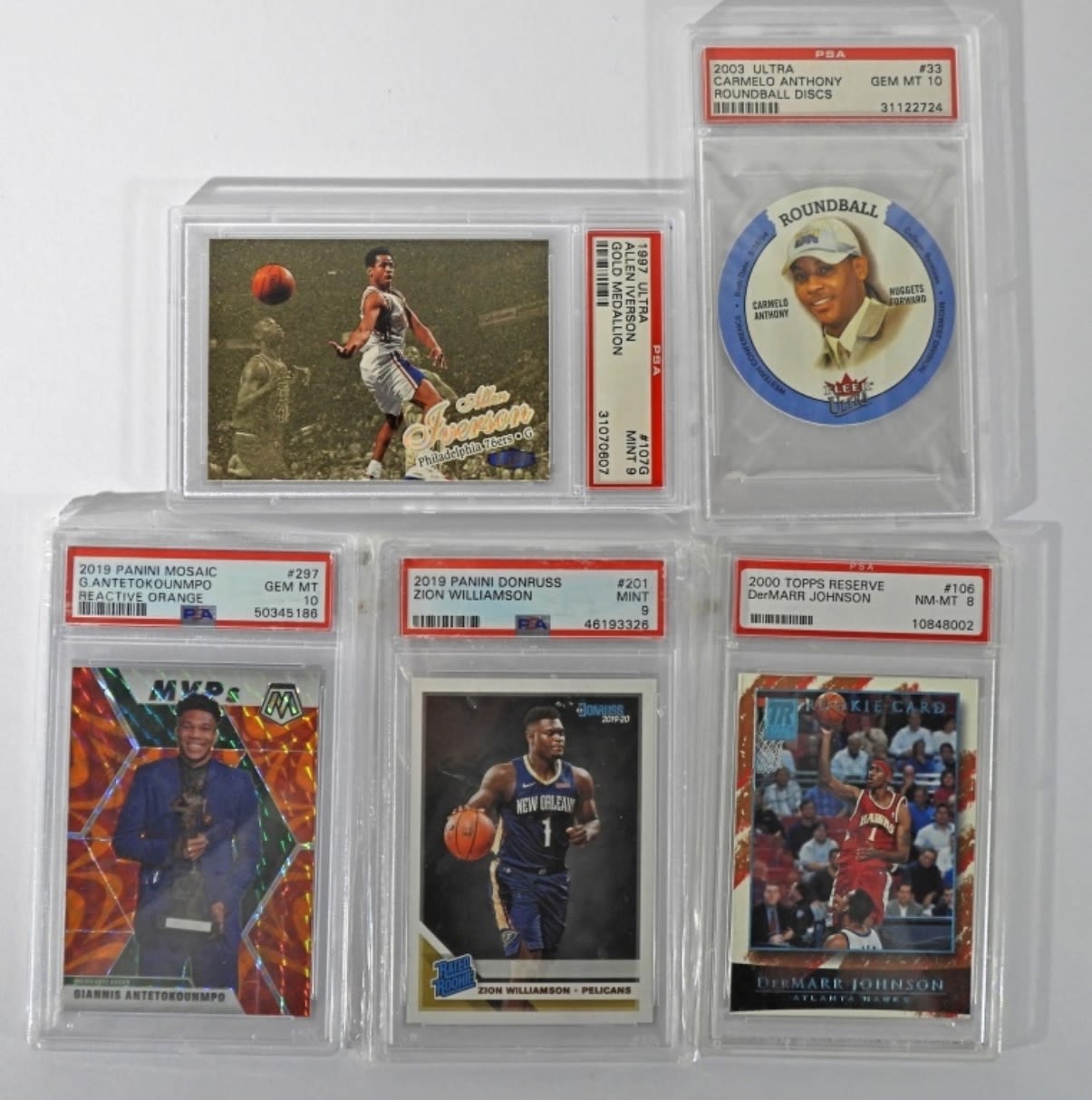 ULTRA ALLEN IVERSON GOLD MEDALLION PSA 9; 2019-20 Panini Mosaic Giannis Antetokounmpo Orange Reactive Prizm PSA 10; 2019 PANINI DONRUSS ZION WILLIAMSON PSA 9 ROOKIE; 2000 TOPPS RESERVE DerMARR JOHNSON PSA 8