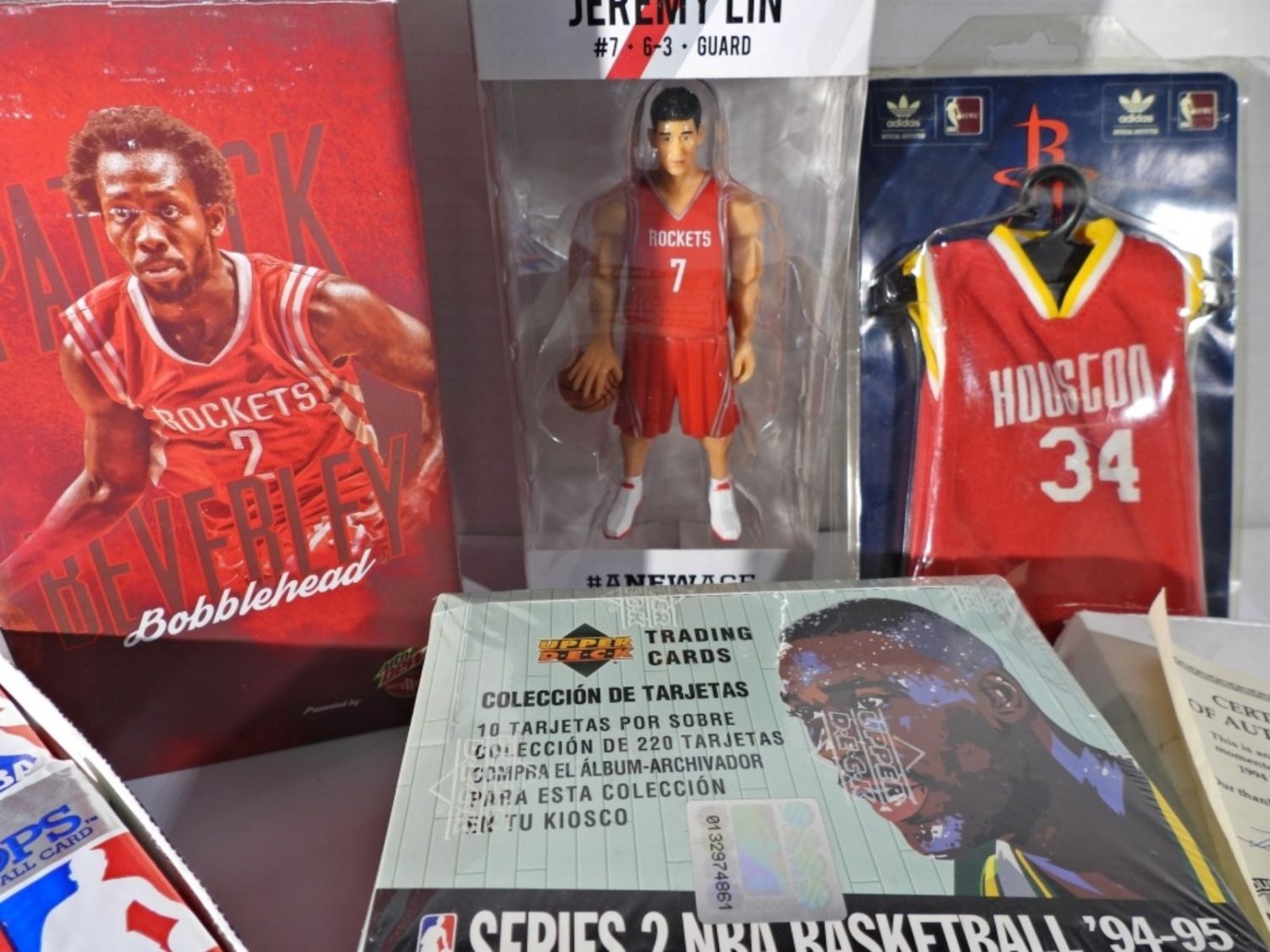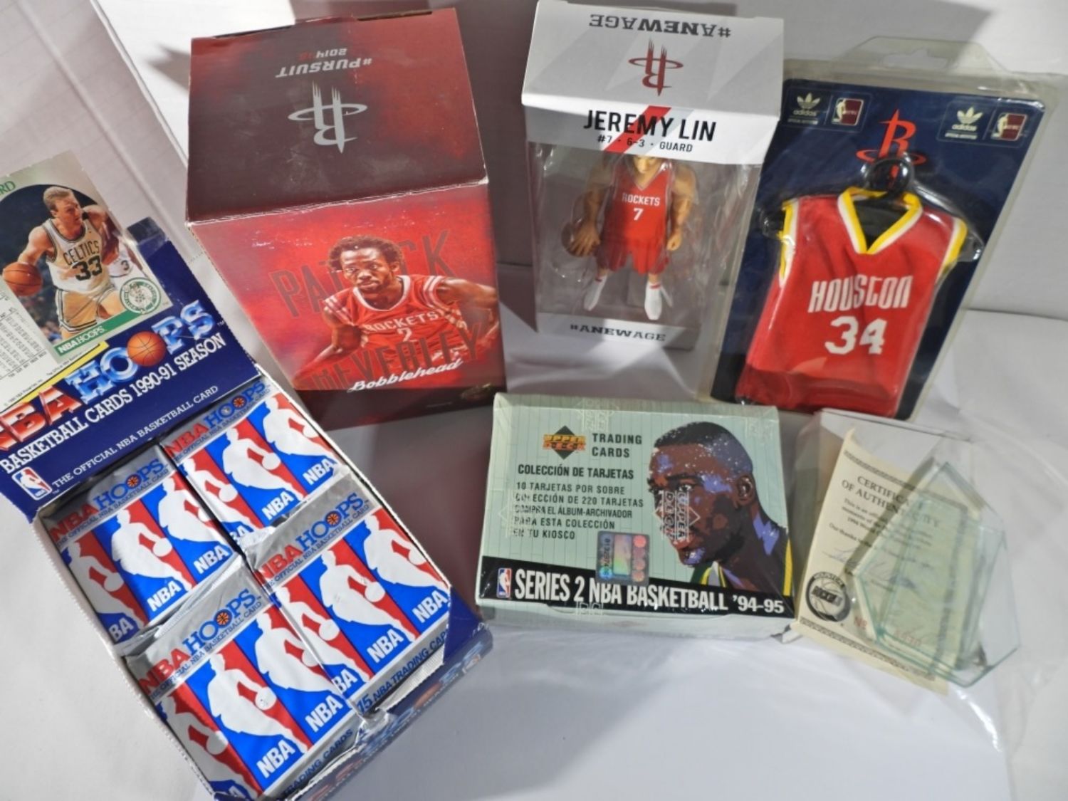 BOBBIN HEADS & MORE – 1994-95 Collector’s Choice Series 2 Basketball Retail Box, 1990-91 NBA Hoops NEAR COMPLETE WAX BOX (30 PACKS), PATRICK BEVERLEY BOBBLEHEAD, JEREMY LIN FIGURE & #34 HOUSTON MINI JERSEY & HOUSTON ROCKETS GLASS FAN AWARD needs glued – FUN LOT