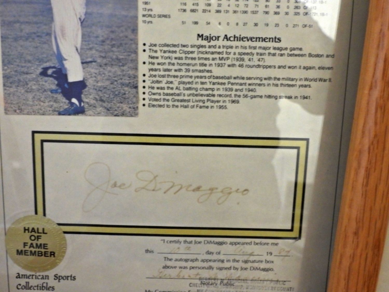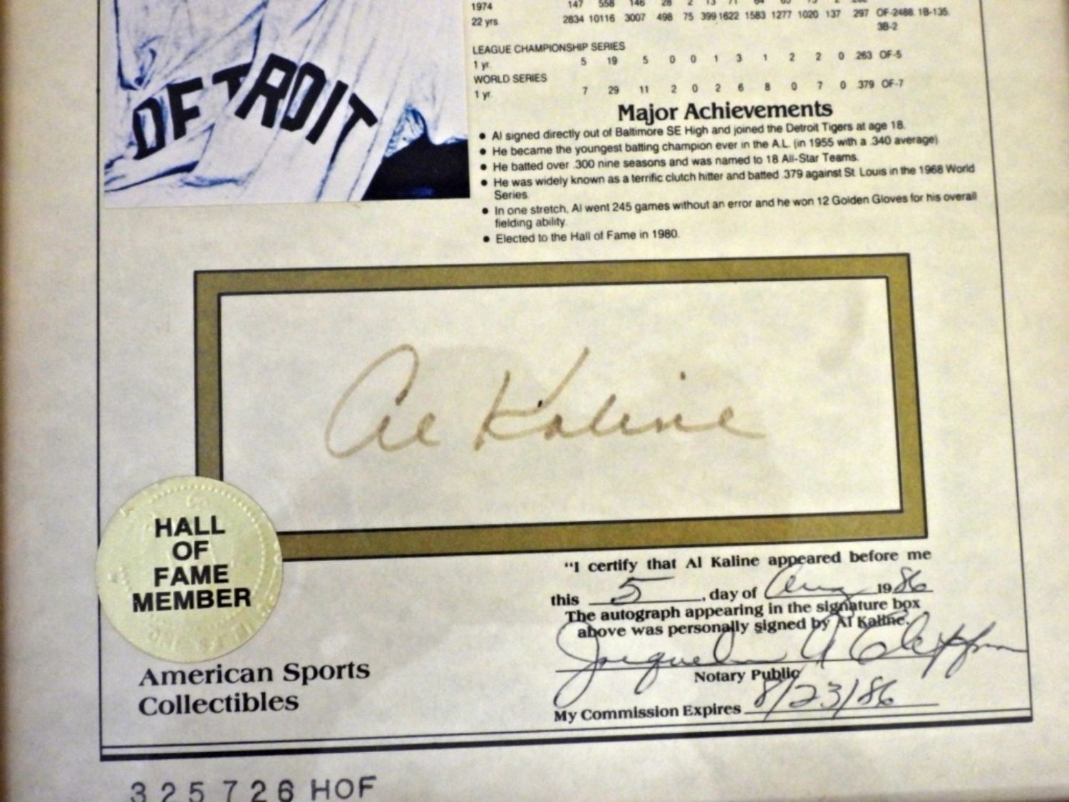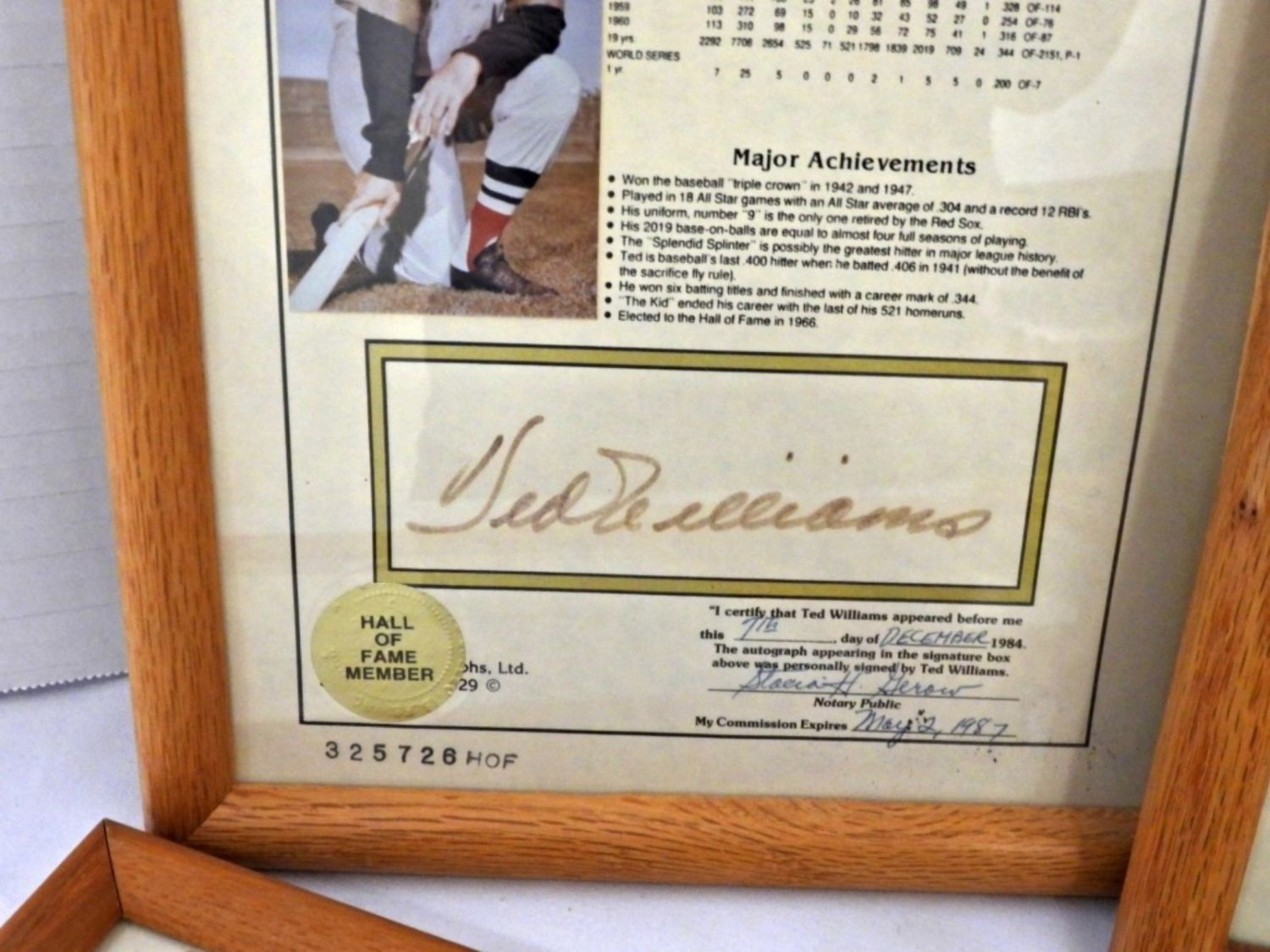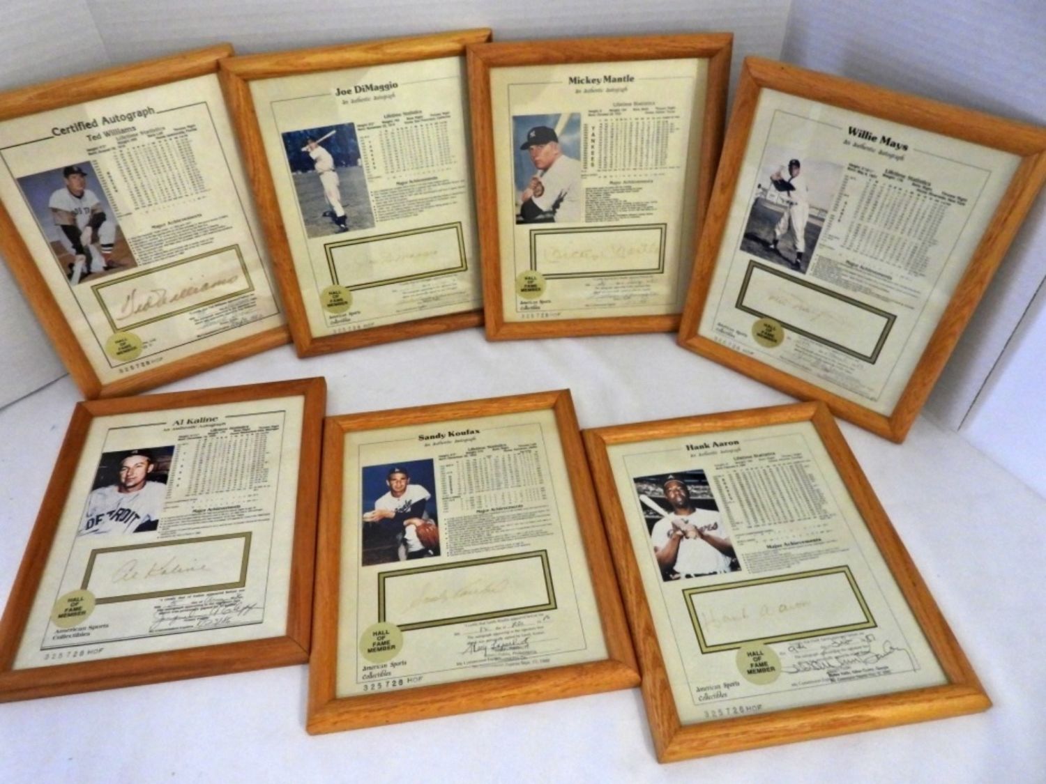 ALL CERTIFIED by NOTARY PUBLIC 1984-1987 – TED WILLIAMS, JOE DiMAGGIO, MICKEY MANTLE, WILLIE MAYS, HANK AARON, SANDY KOUFAX, AL KALINE – in 9×11 FRAMES – SIGNATURES SHOW SOME SIGNS of FADDING. LIFETIME STATISTICS PHOTO