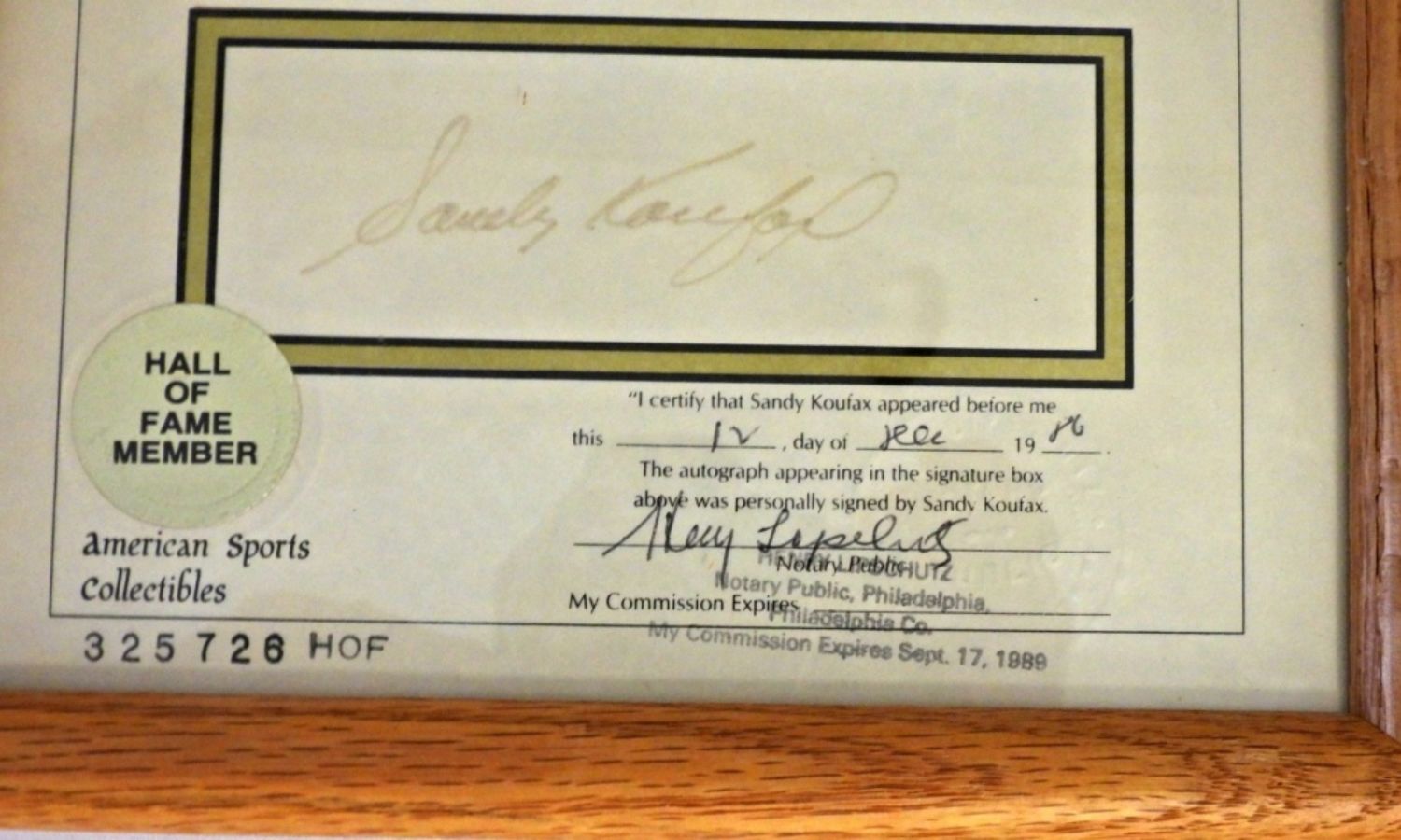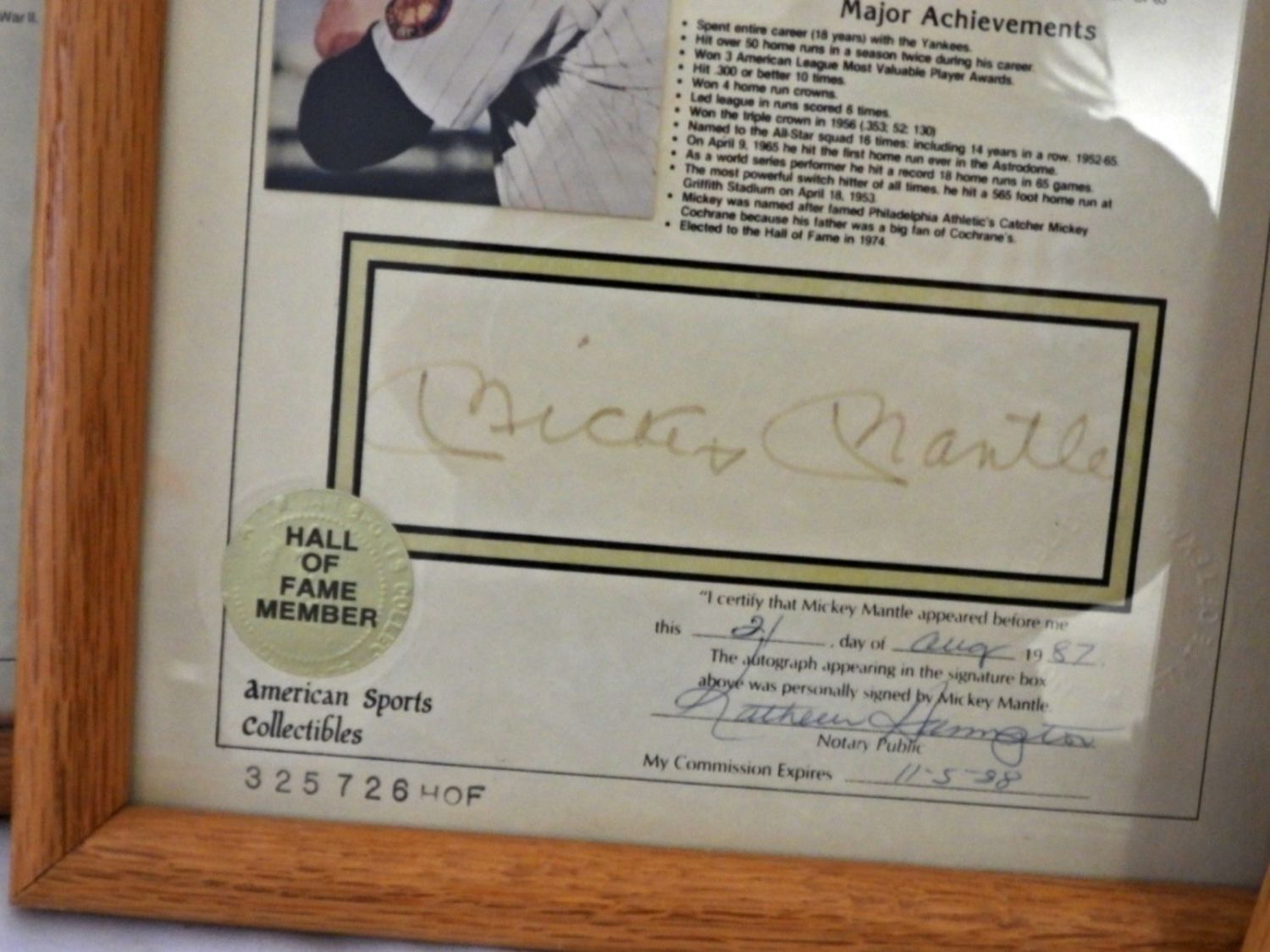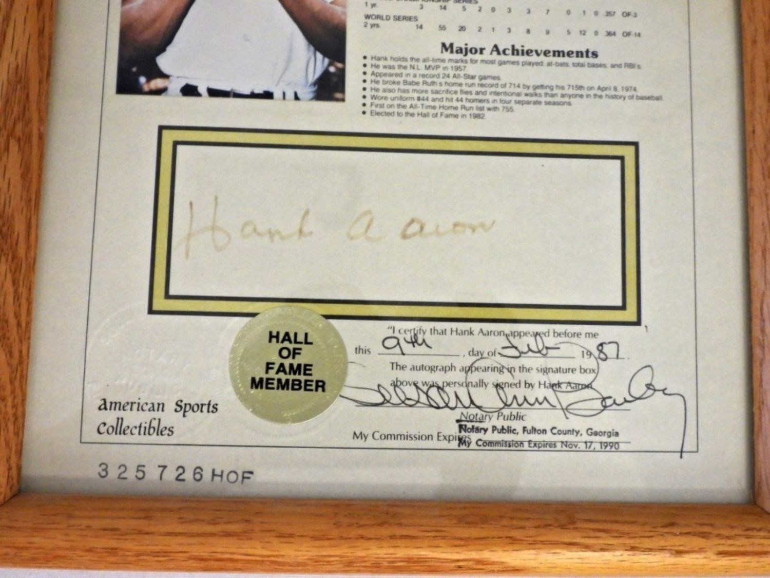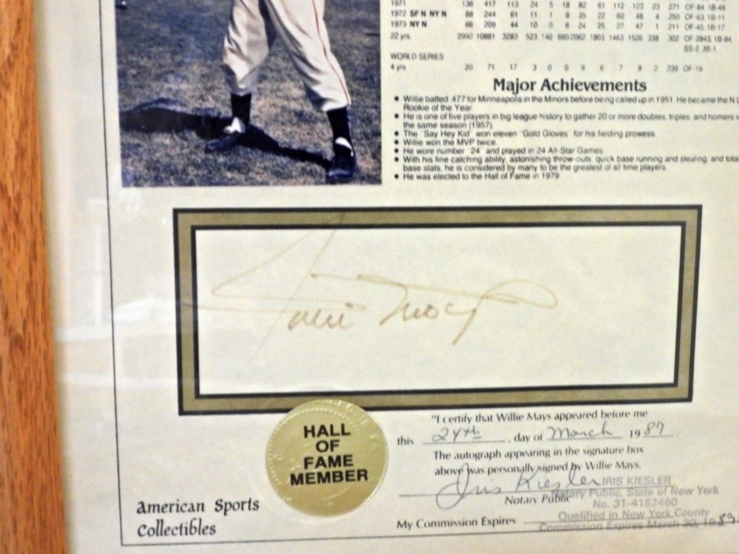 ALL CERTIFIED by NOTARY PUBLIC 1984-1987 – TED WILLIAMS, JOE DiMAGGIO, MICKEY MANTLE, WILLIE MAYS, HANK AARON, SANDY KOUFAX, AL KALINE – in 9×11 FRAMES – SIGNATURES SHOW SOME SIGNS of FADDING. LIFETIME STATISTICS PHOTO