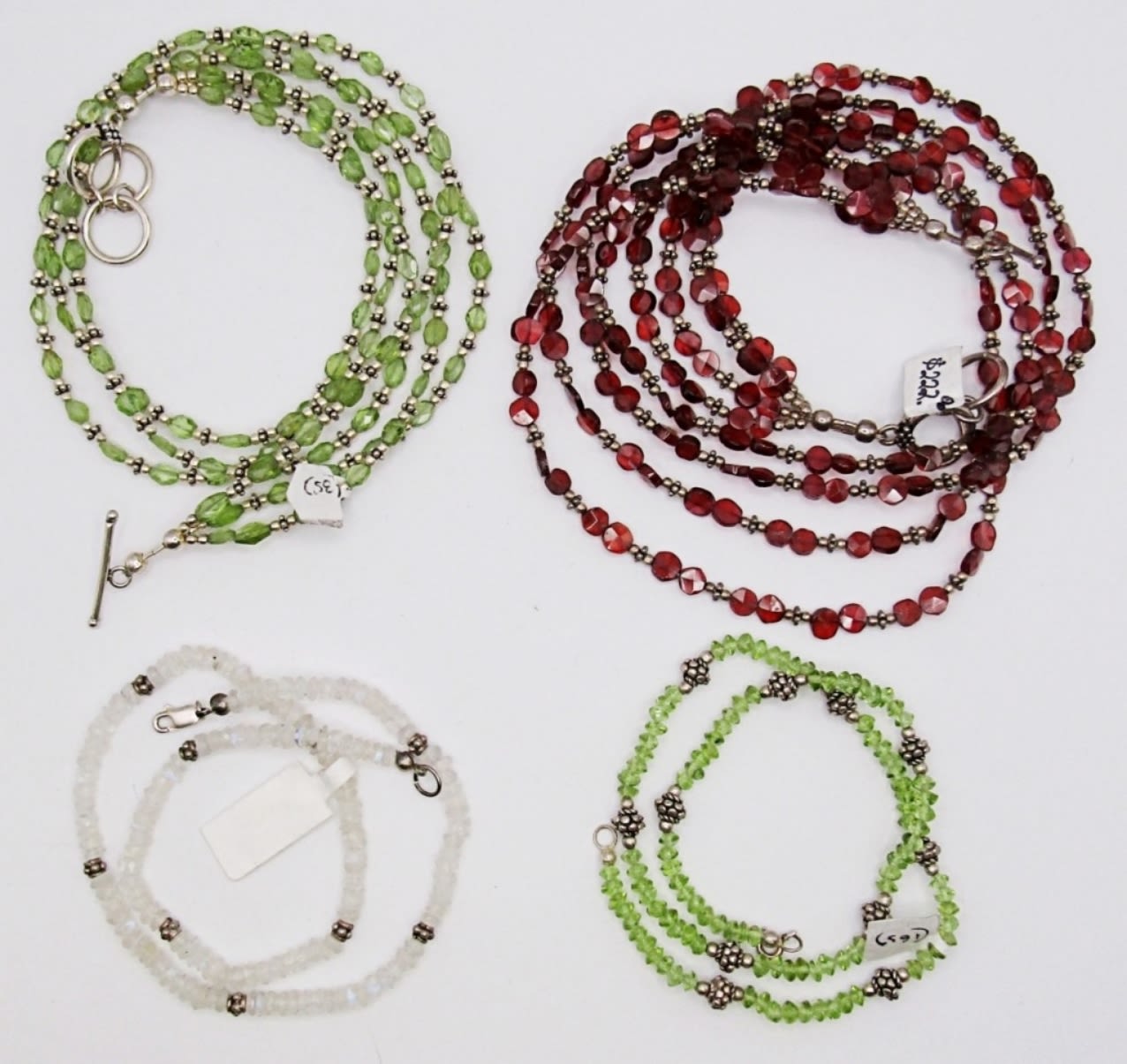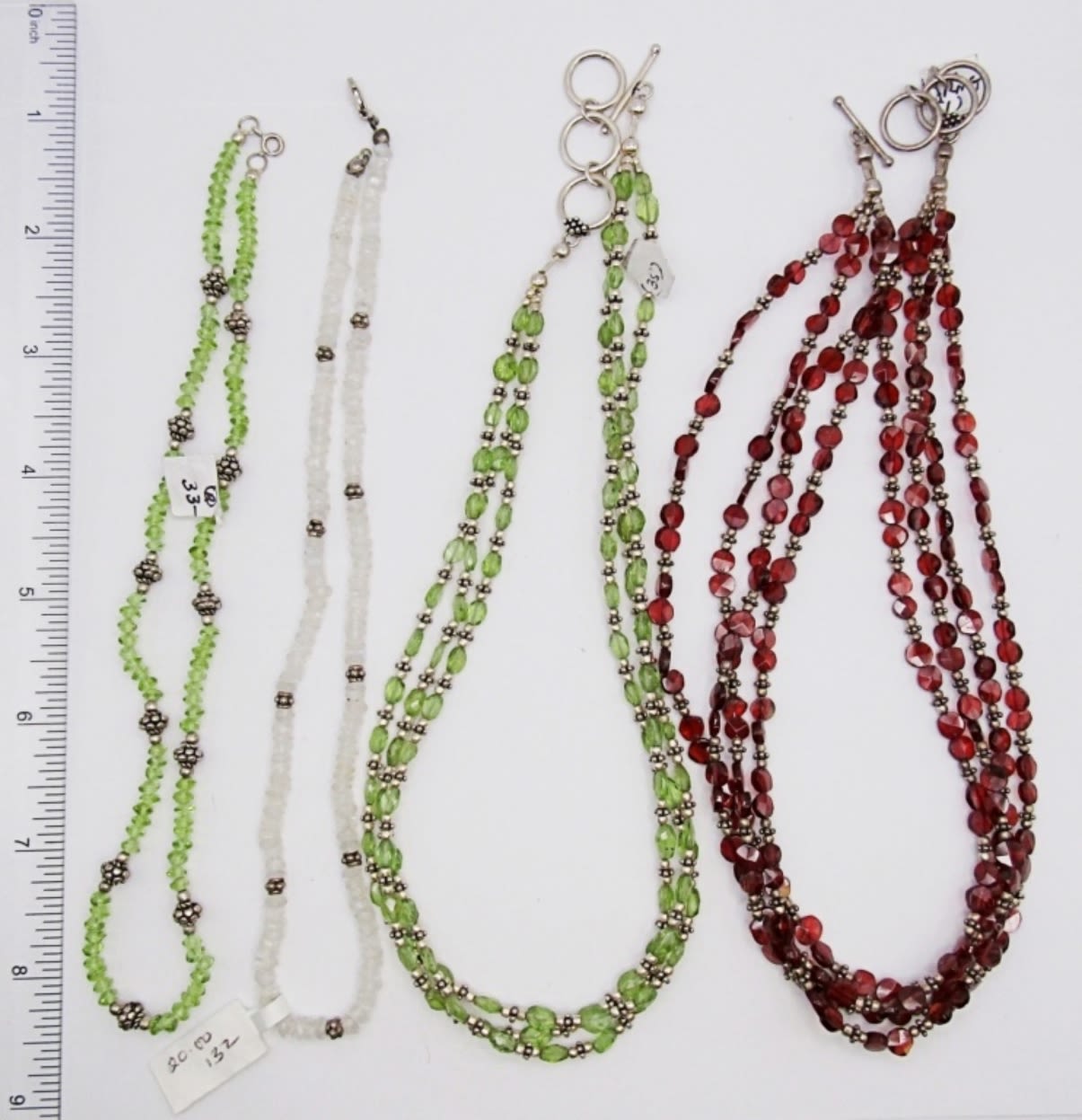 2- 15IN LONG WITH SPRING CLASP GREEN AND WHITE AND STERLING BEADS, STAMPED 925 ON THE CLASP, 2- 17IN LONG RED AND GREEN WITH STERLING BEADS, TOGGLE CLASP STAMPED 925
