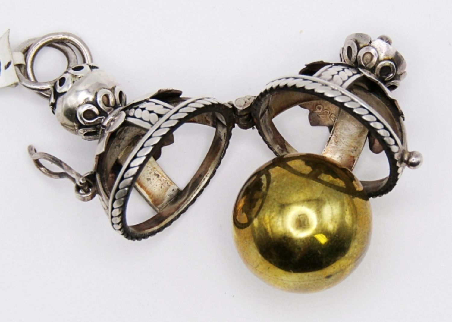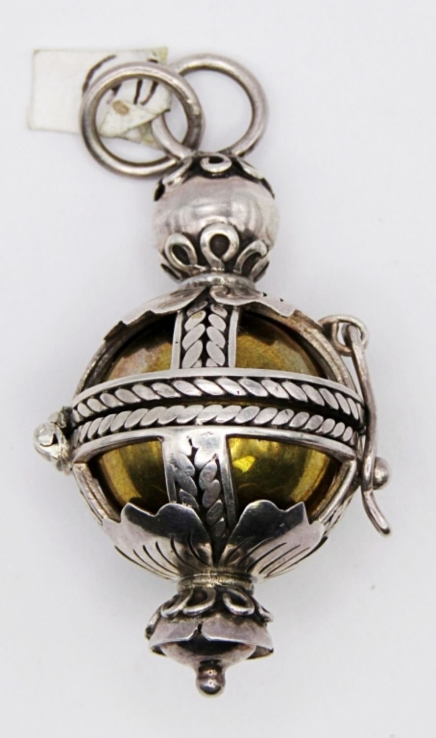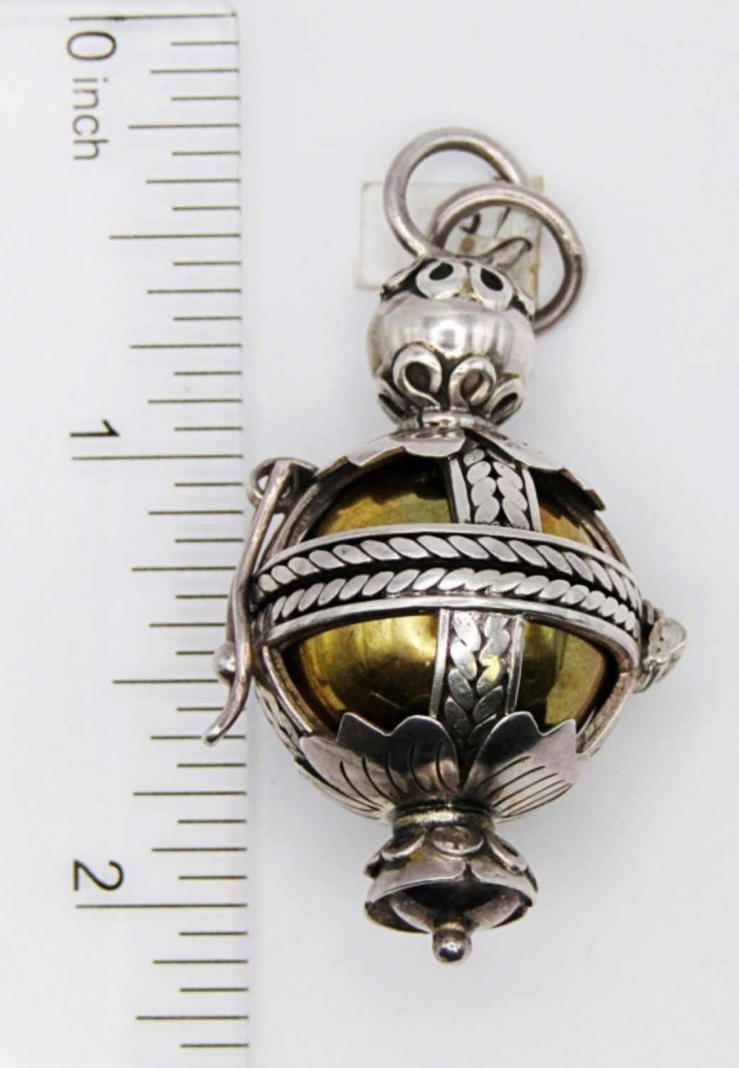 15.6DWT,2IN LONG, PENDANT OPENS AND HAS A GOLD PLATED STERLING BALL INSIDE, STAMPED 925 ON THE INSIDE