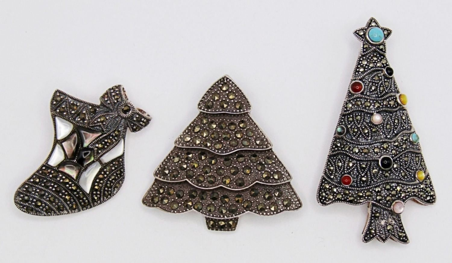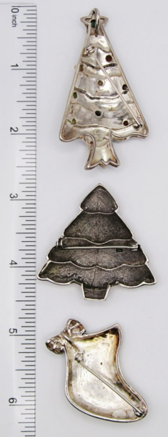 28.9DWT, 1 1/2 – 2 1/2IN LONG, ALL STAMPED 925, 2- CHRISTMAS TREES, 1- STOCKING