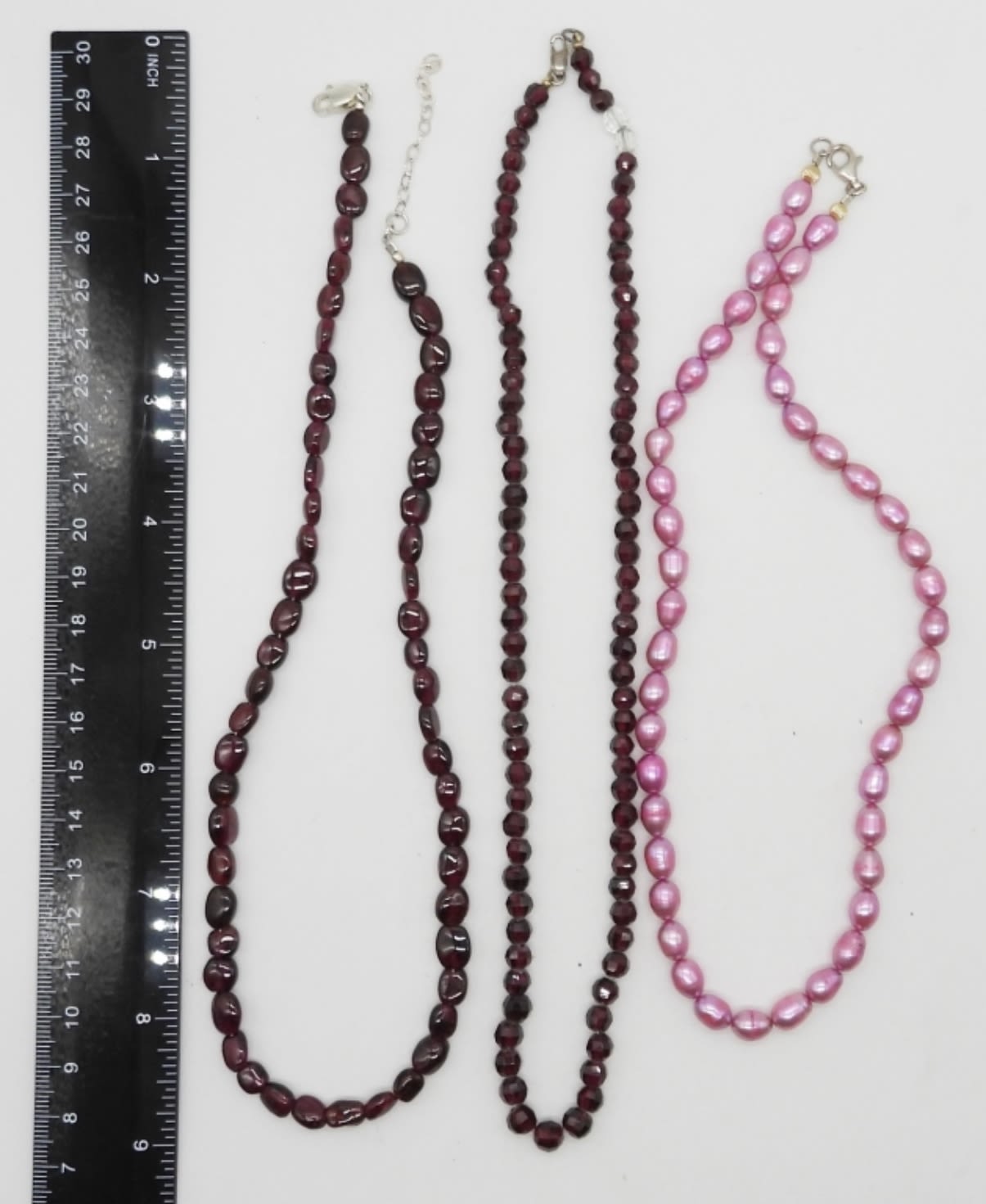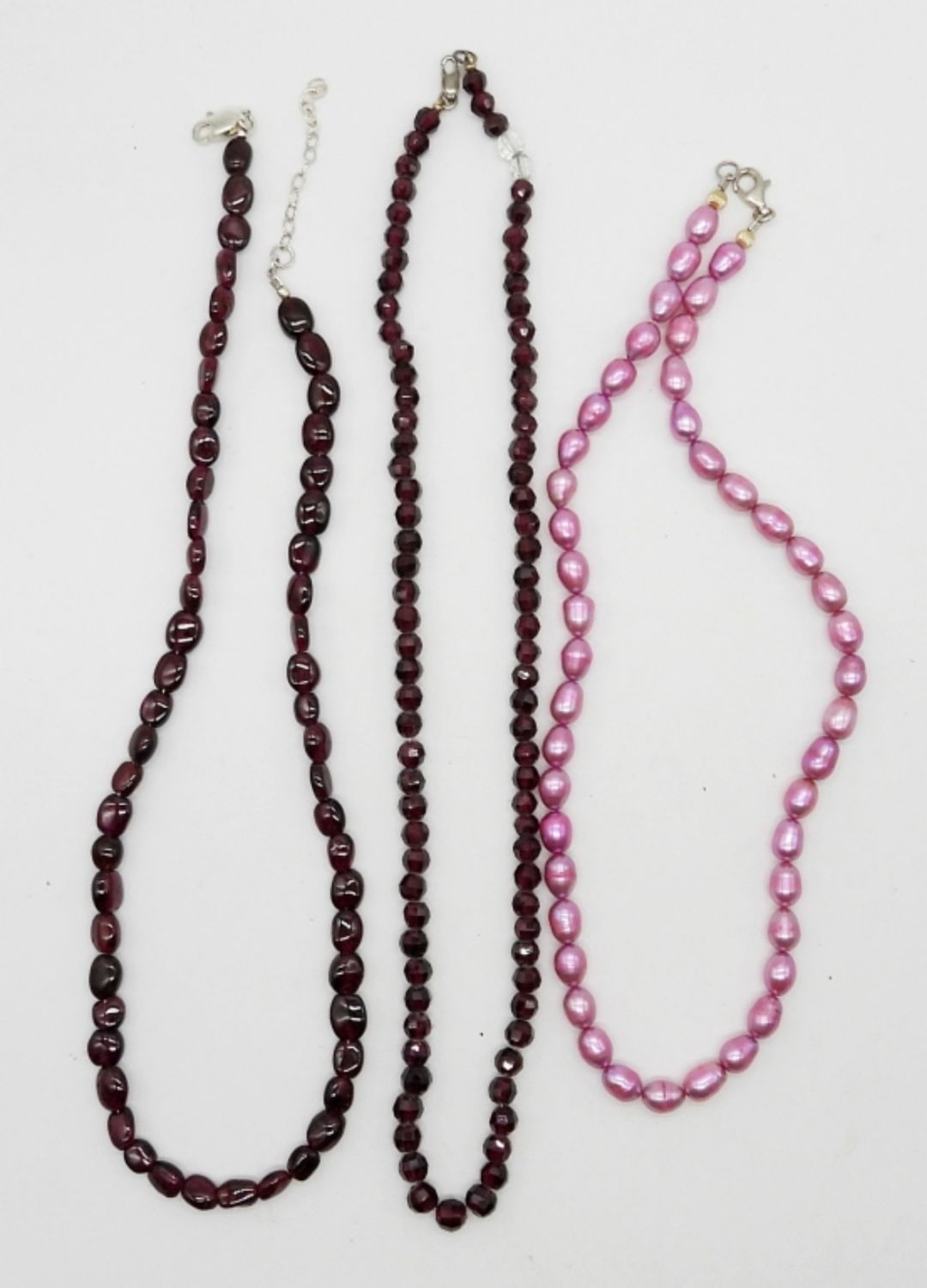 (1) 16″ PINK NATURAL STONE CHOKER; (2) 18″ CHOKERS WITH RED GEMSTONES – ALL MARKED 925