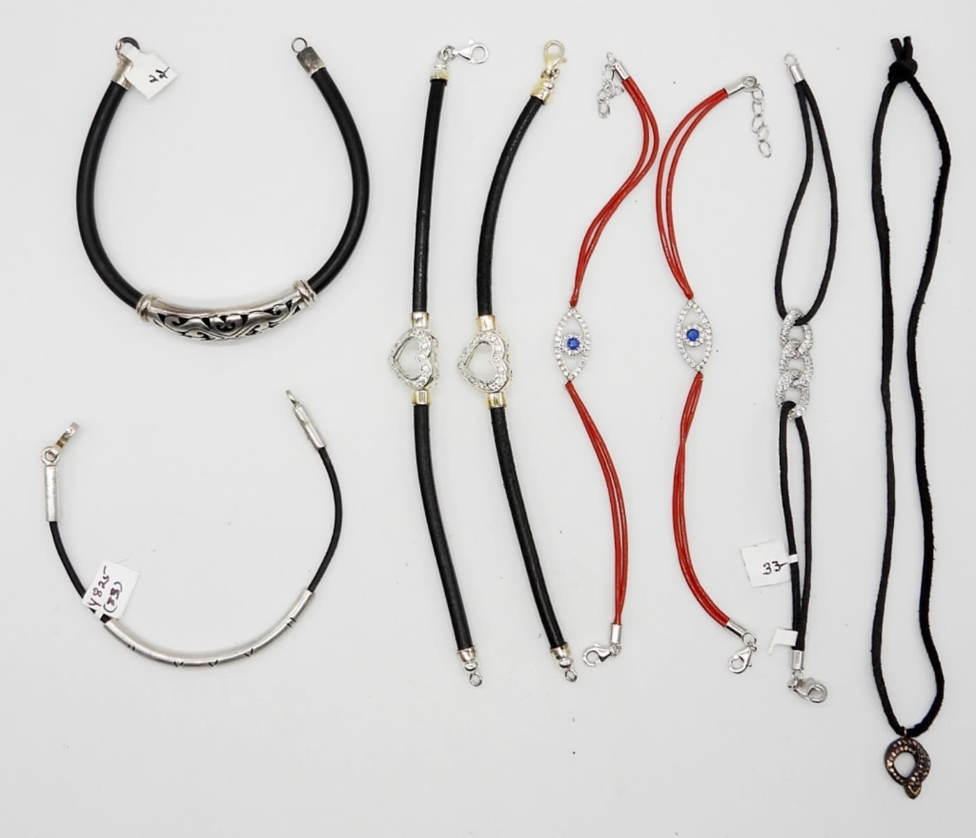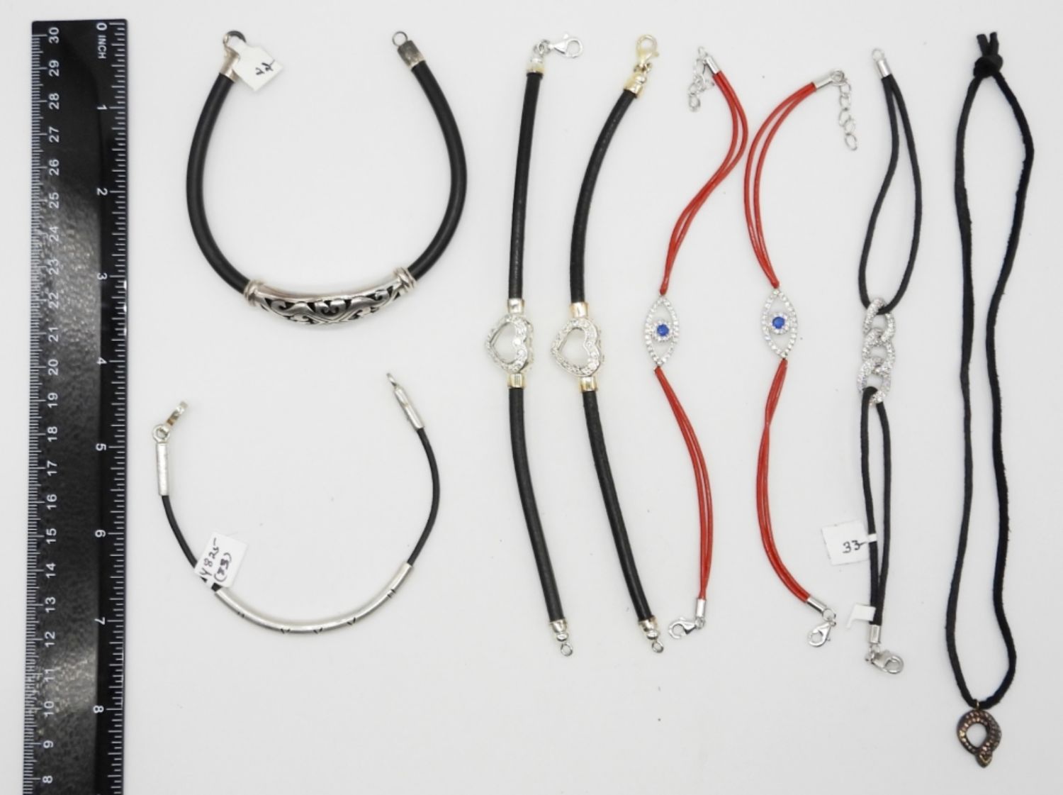 LEATHER & STERLING SILVER MARCASITE CHOKER – MARKED 925; (7) RED & BLACK LEATHER STERLING SILVER BRACELETS