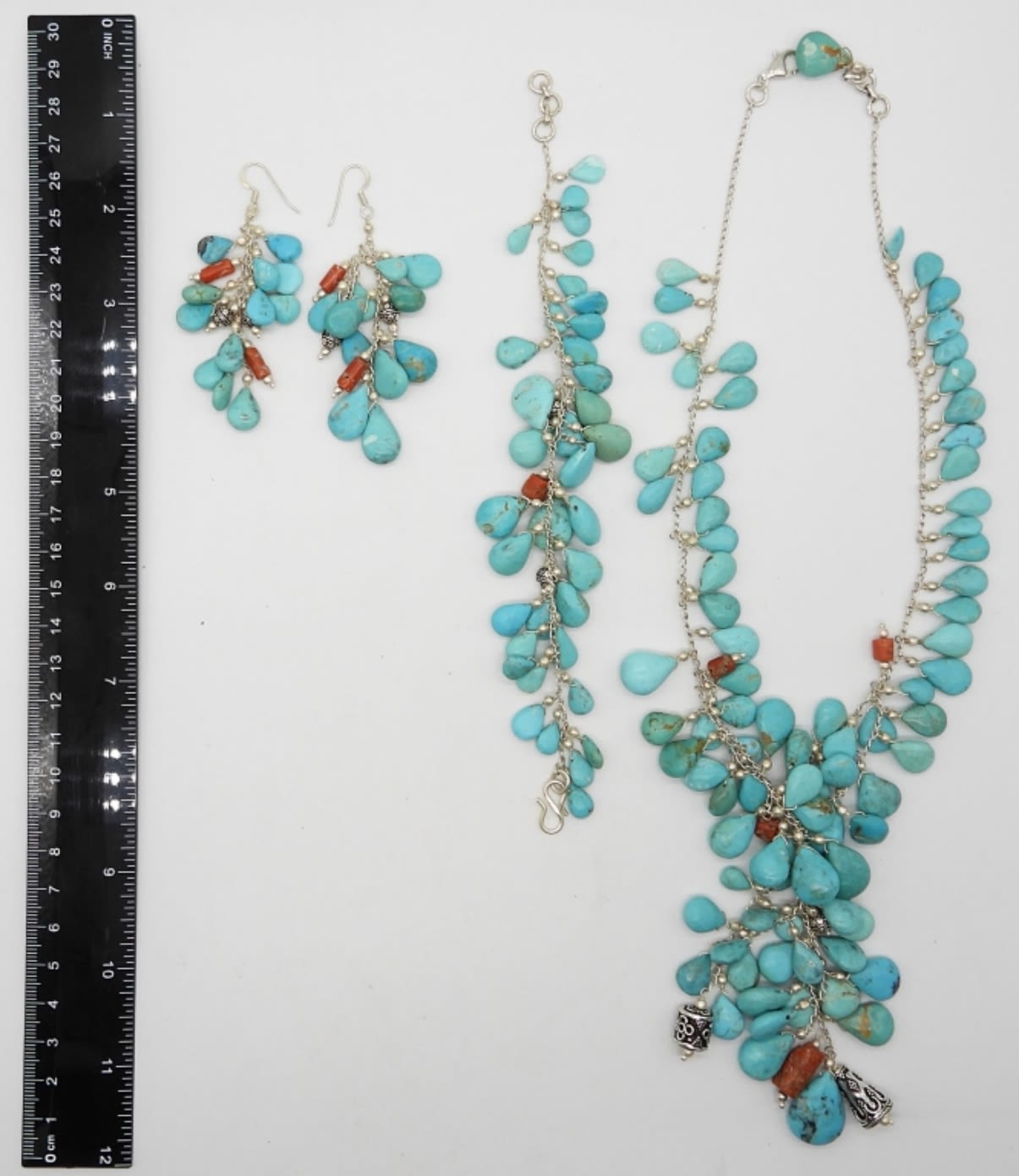 STERLING SILVER & LARGE TURQUOISE STONES; 17″ NECKLACE; 7″ BRACELET; MATCHING EARRINGS – MARKED 925