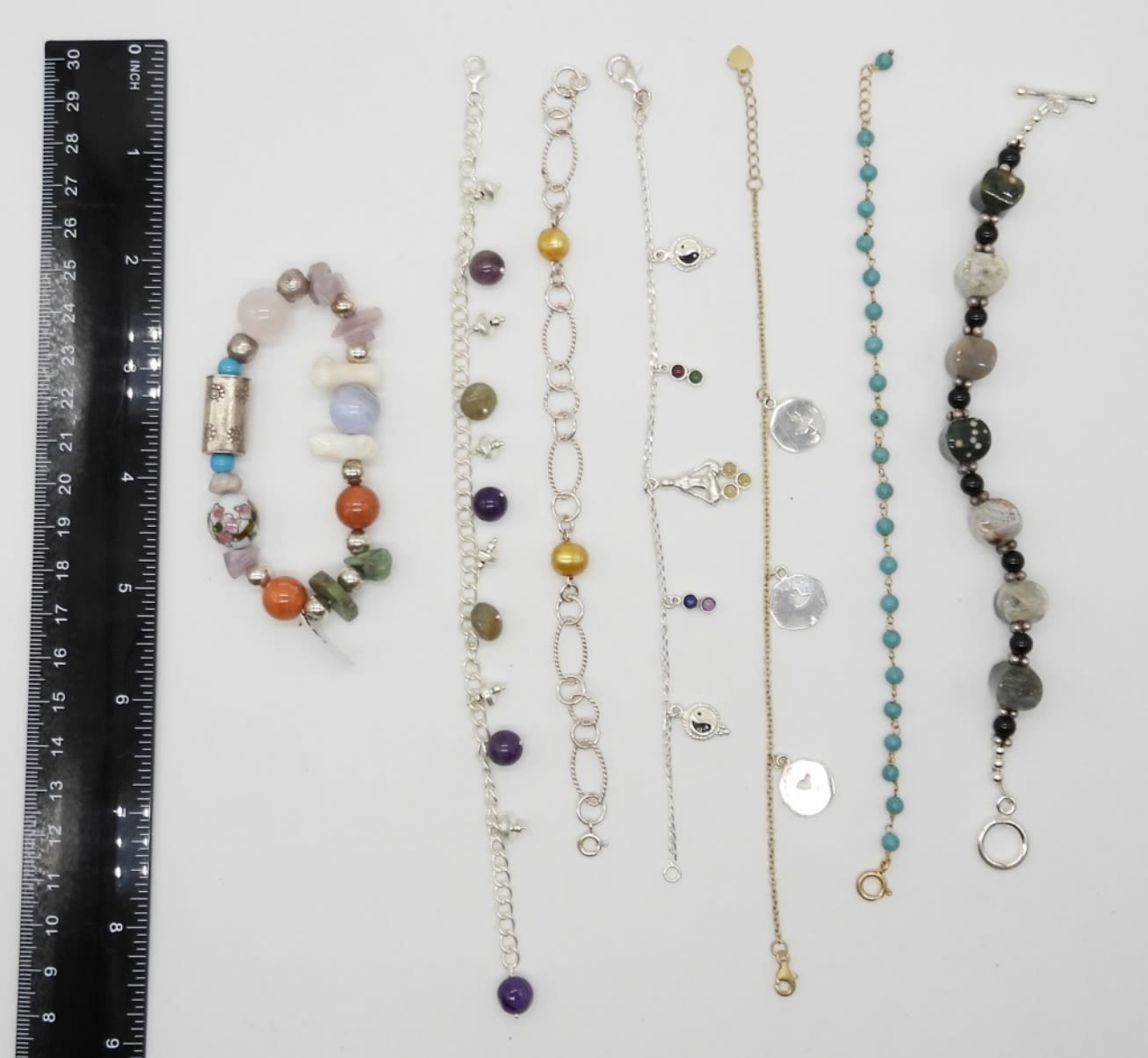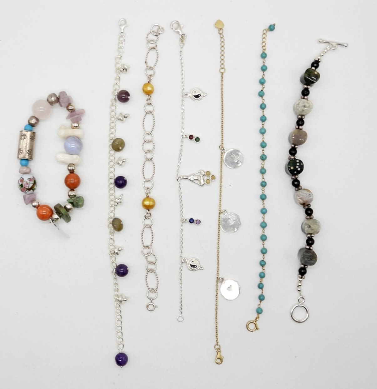 STERLING SILVER 7″-8″ BRACELETS WITH NATURAL STONES, TURQUOISE & CHARMS – (6) MARKED 925