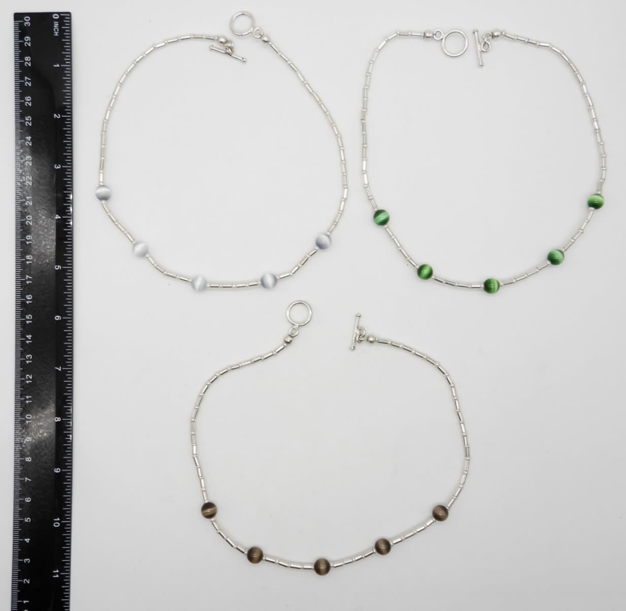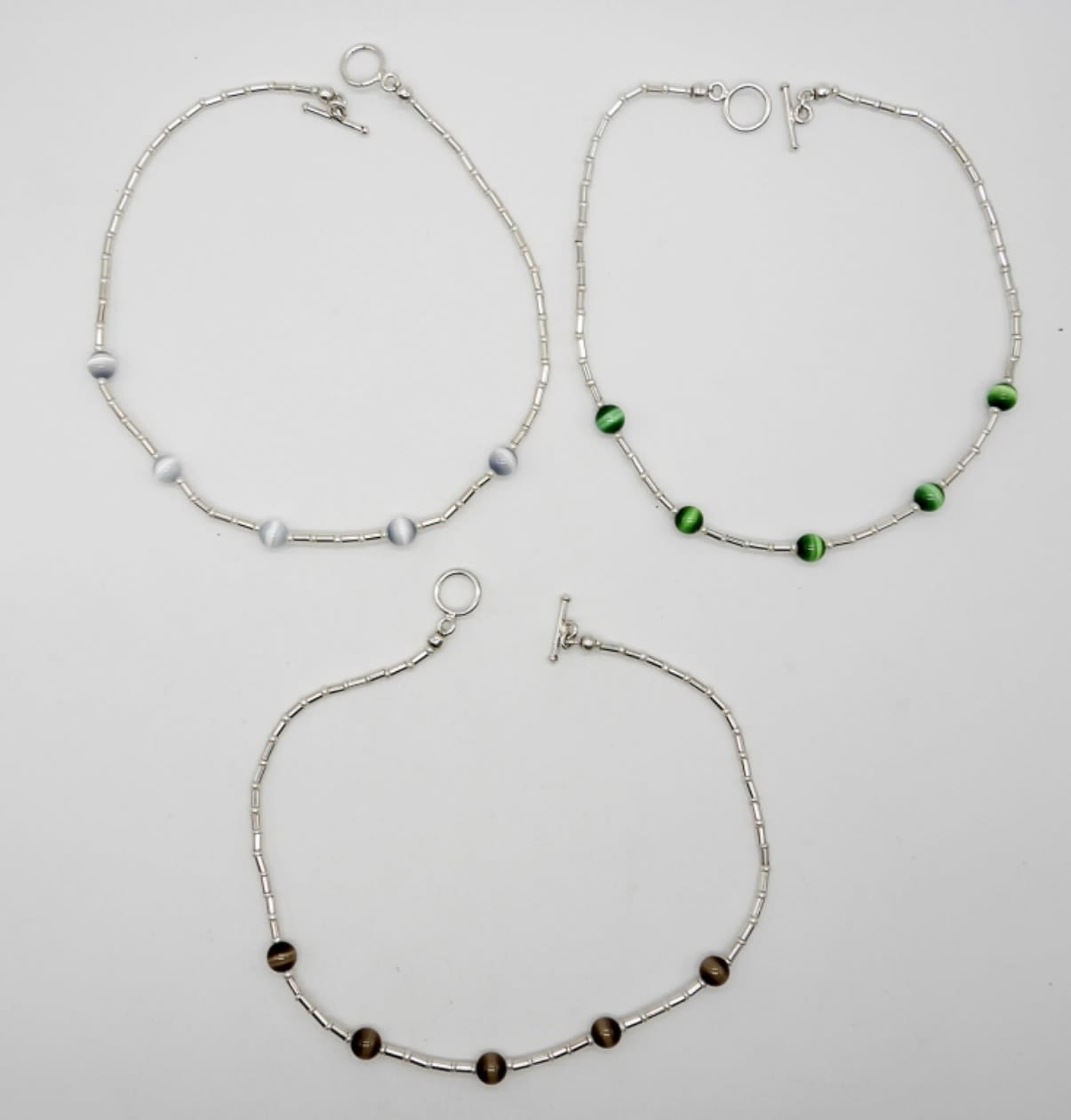 (3) 16″ CHOKERS, STERLING SILVER & CATS EYE NATURAL POLISHED STONES; 28 DWT