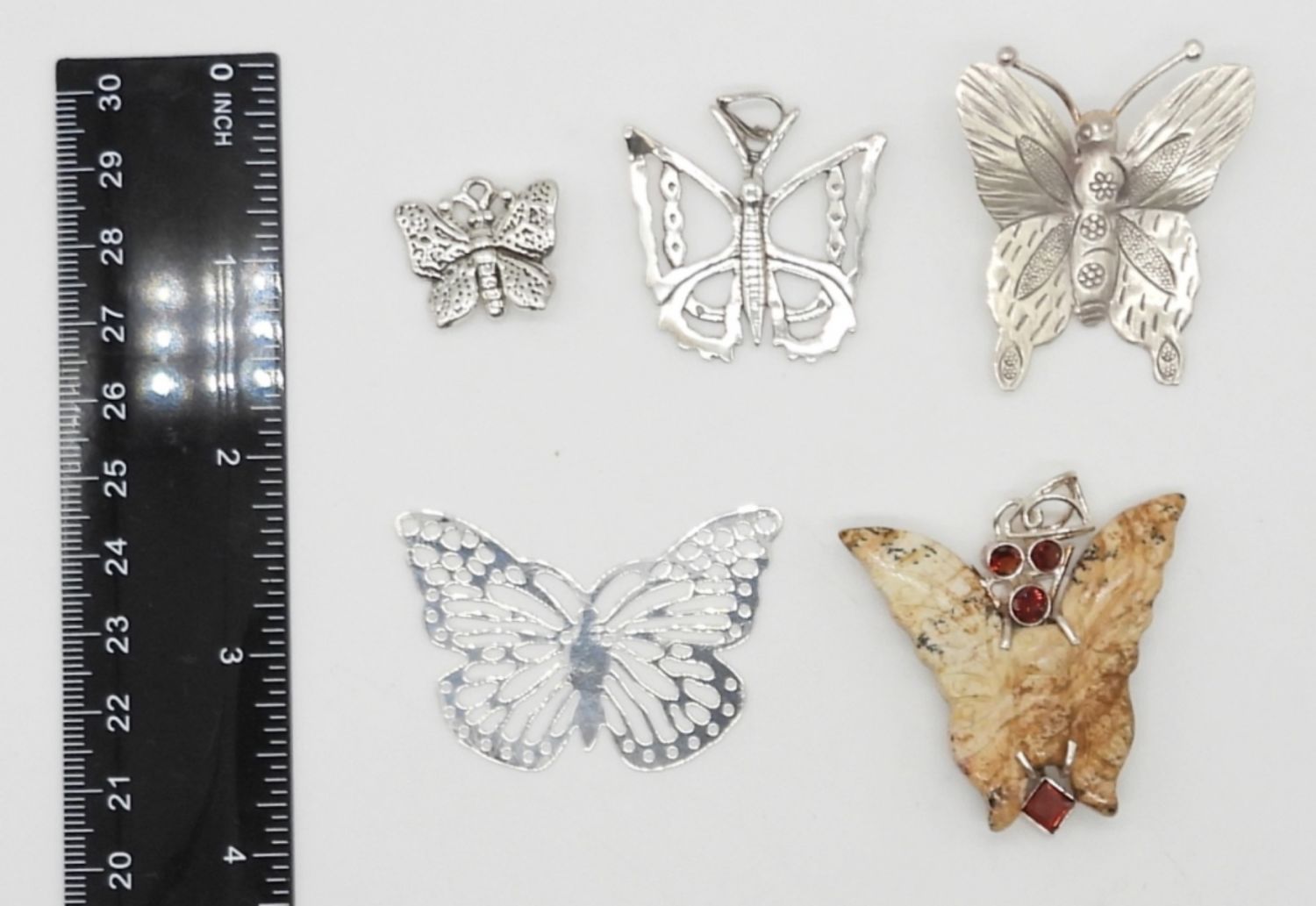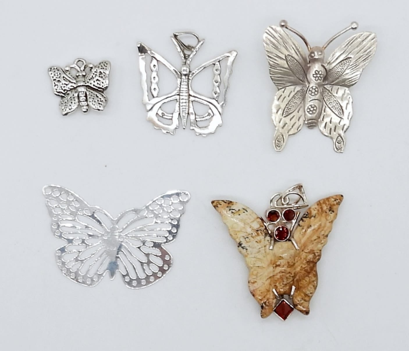 STERLING SILVER BUTTERFLY PENDANTS, (1) WITH HANDCRAFTED CARVED NATURAL STONE