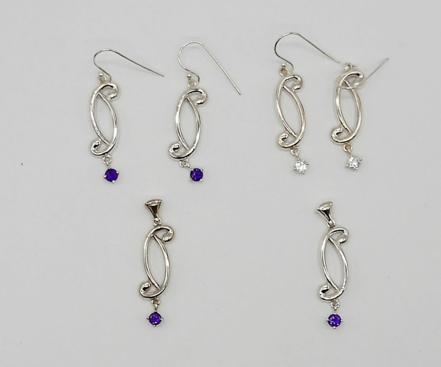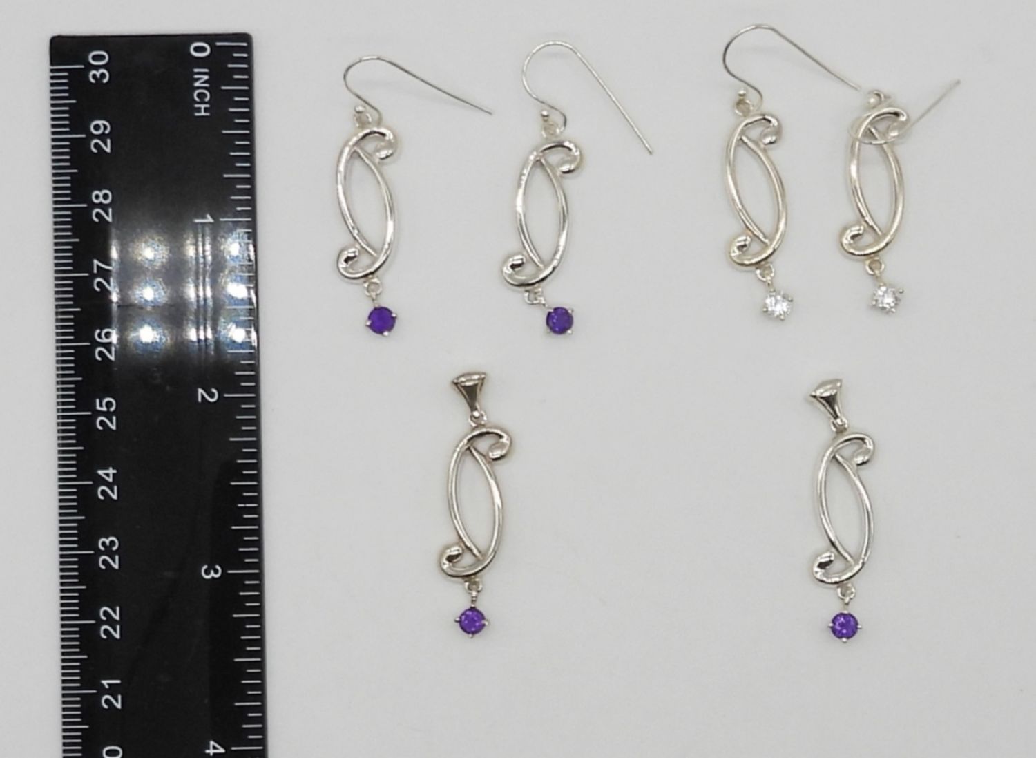 (2) PAIRS OF EARRINGS WITH (2) MATCHING PENDANTS; CLEAR & PURPLE GEMSTONES; 14 DWT – ALL MARKED 925