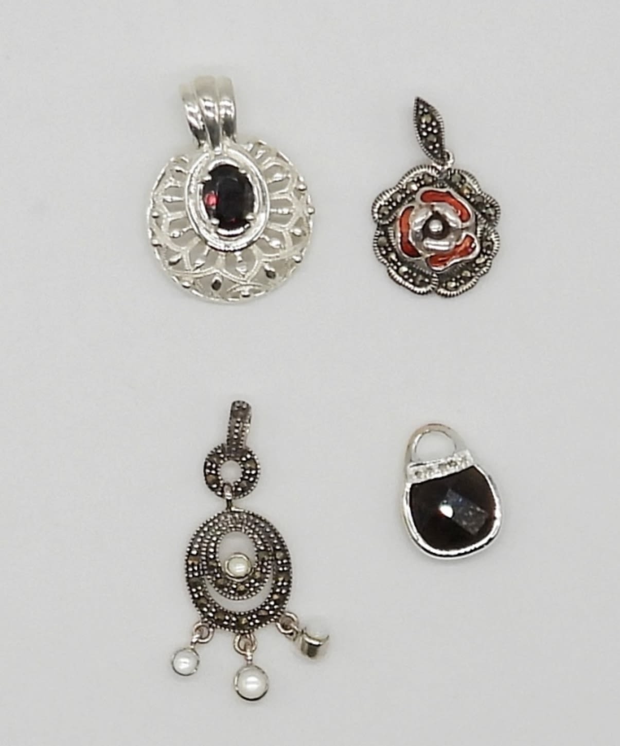 (4) ORNATE STERLING / MARCASITE / ONYX PENDANTS – ALL MARKED 925 – 10 DWT