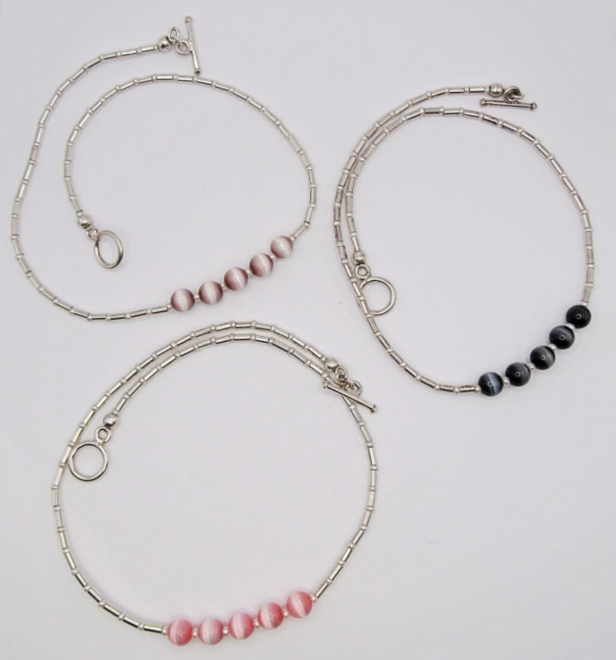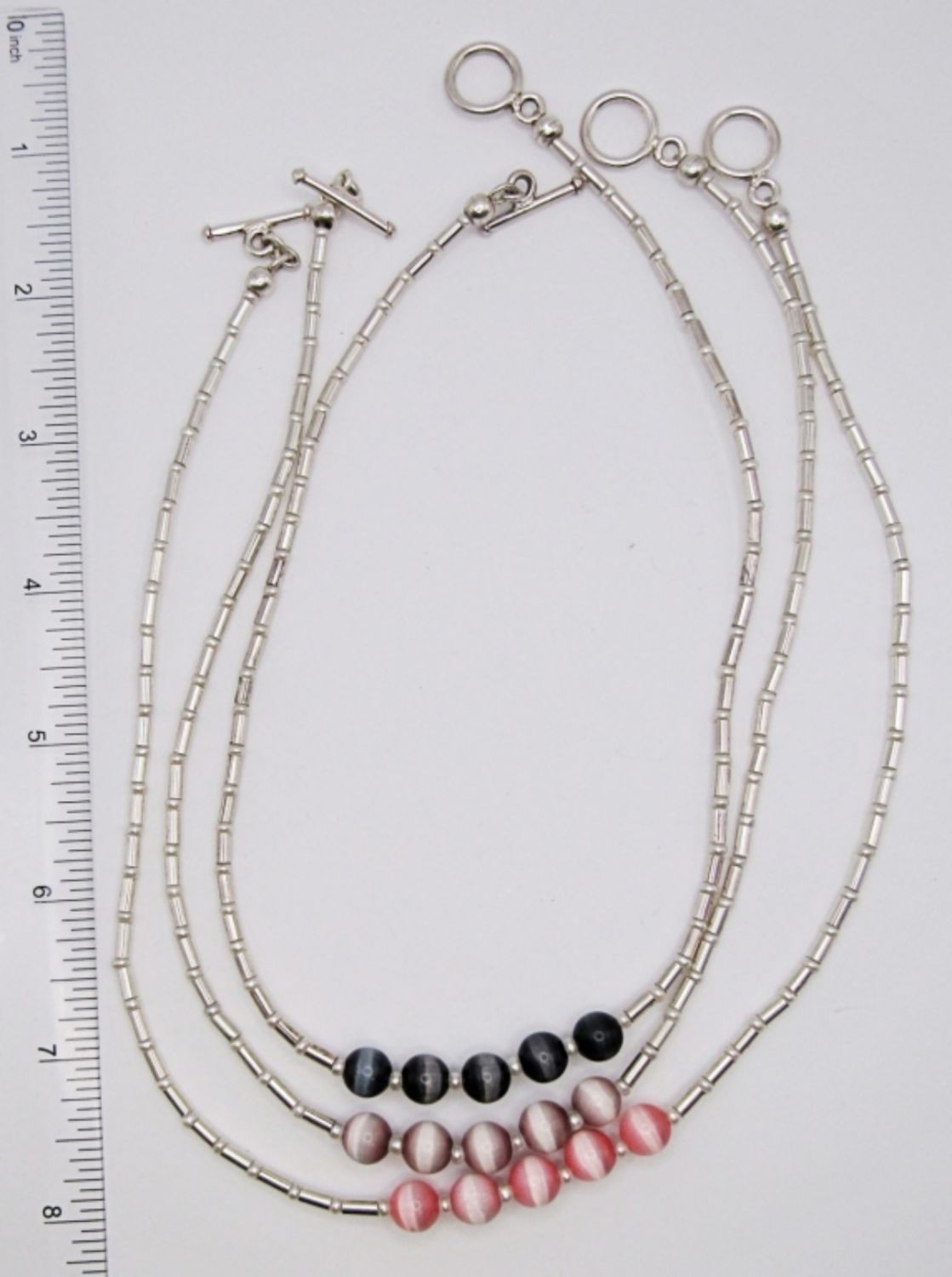 25DWT, 1- 17IN LONG 2-18IN LONG, PINK, PURPLE, BLACK BEADING, TOGGLE CLASP STAMPED 925 ON THE CLASP AREA
