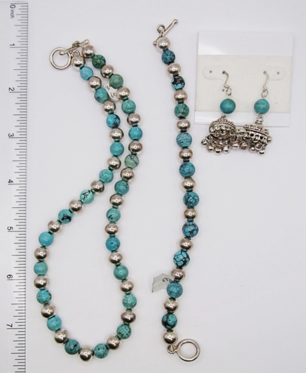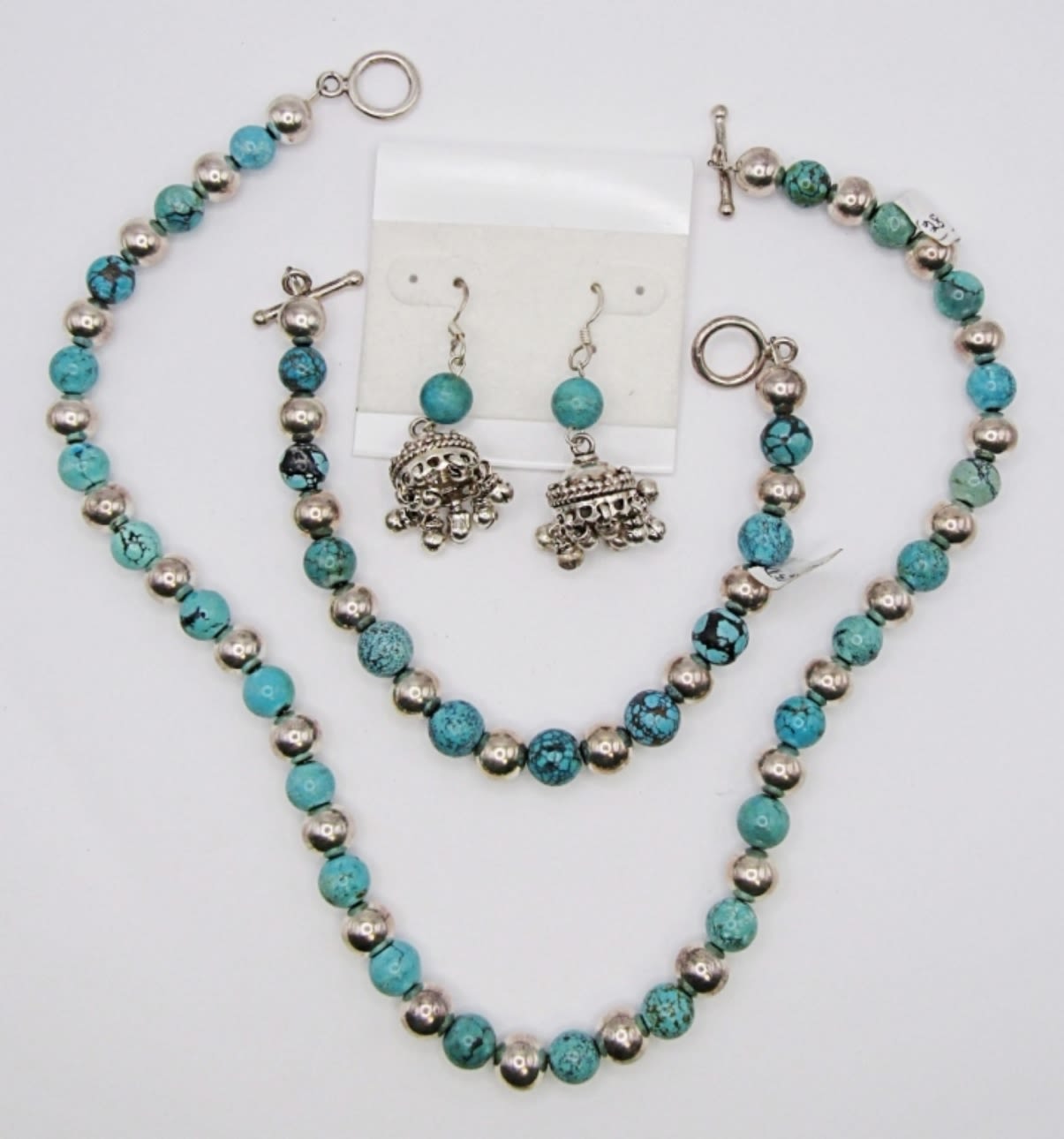 20DWT, STERLING, TURQUOISE BEADS, 16IN LONG NECKLACE, 8IN LONG NECKLACE, WITH TOGGLE CLASP STAMPED 925, A PAIR OF DANGLED PIERCED EARRINGS, STAMPED 925