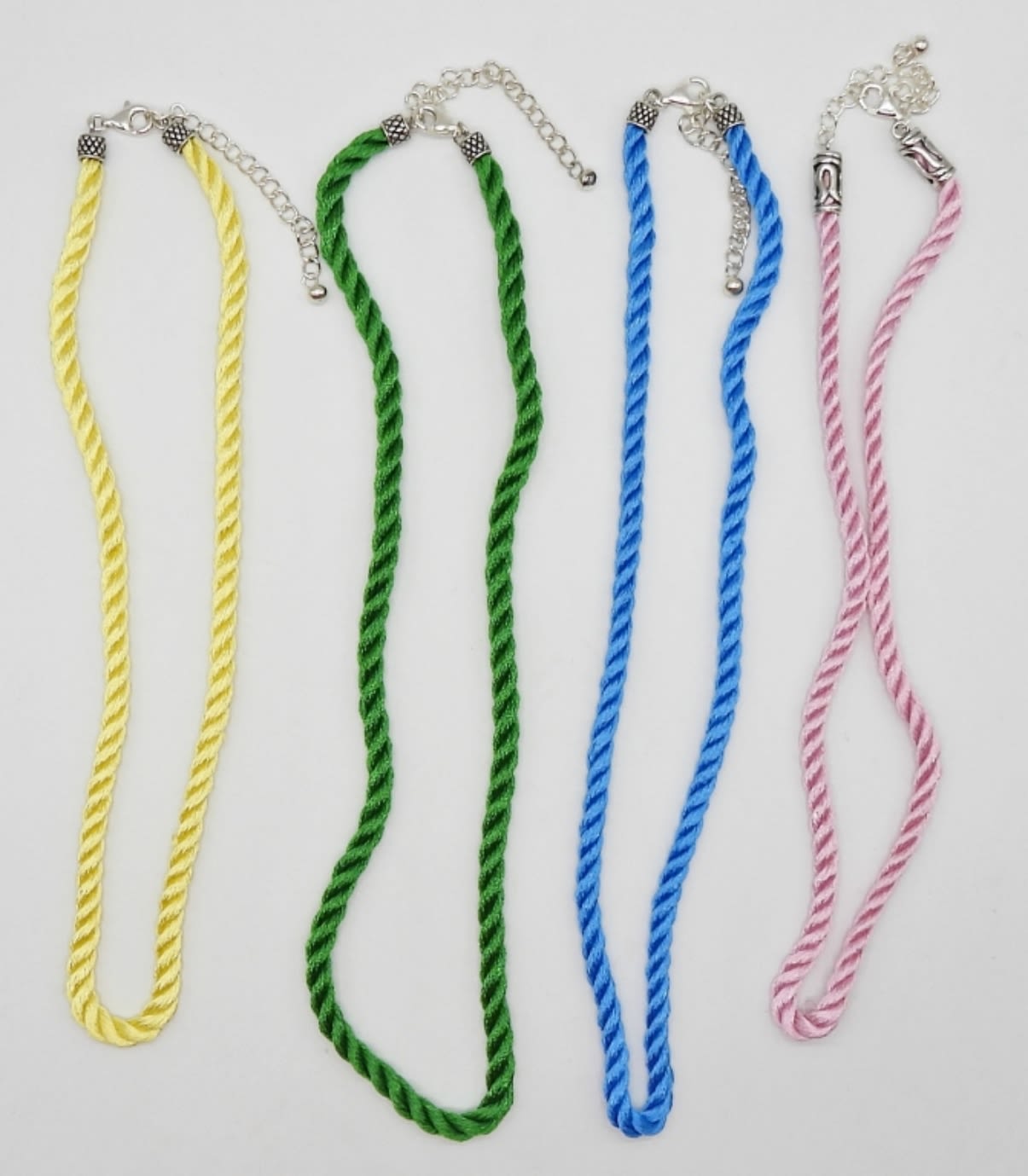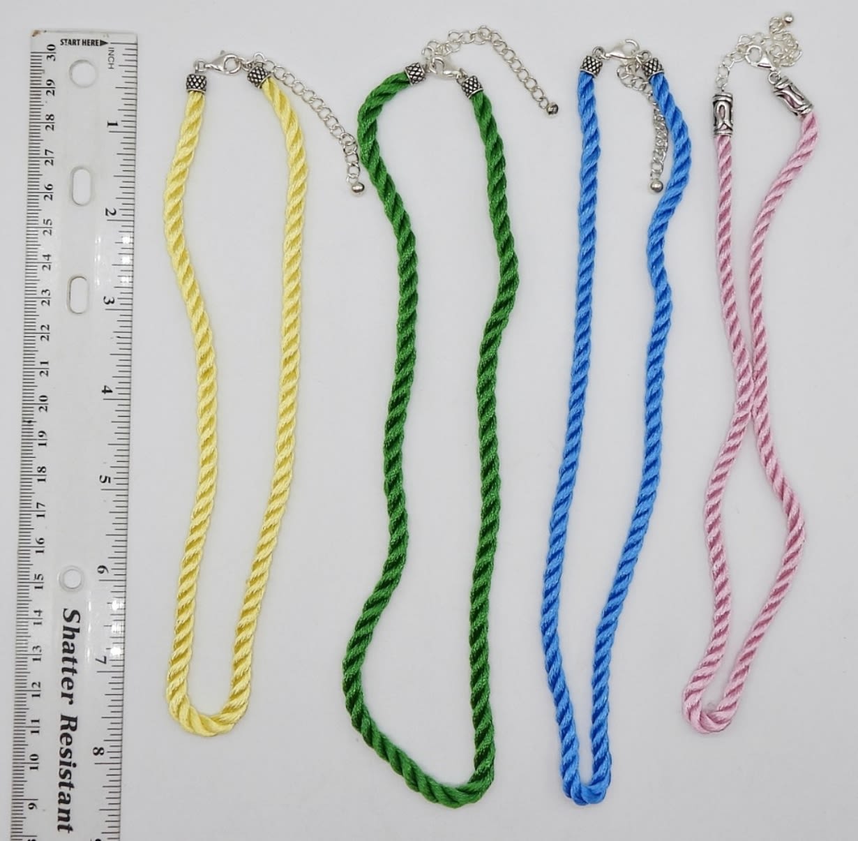 19 INCH MULTI COLOR ROPE CHAINS PINK, BLUE, YELLOW & GREEN, WITH STERLING CHAIN CLASPS, MARKED 925