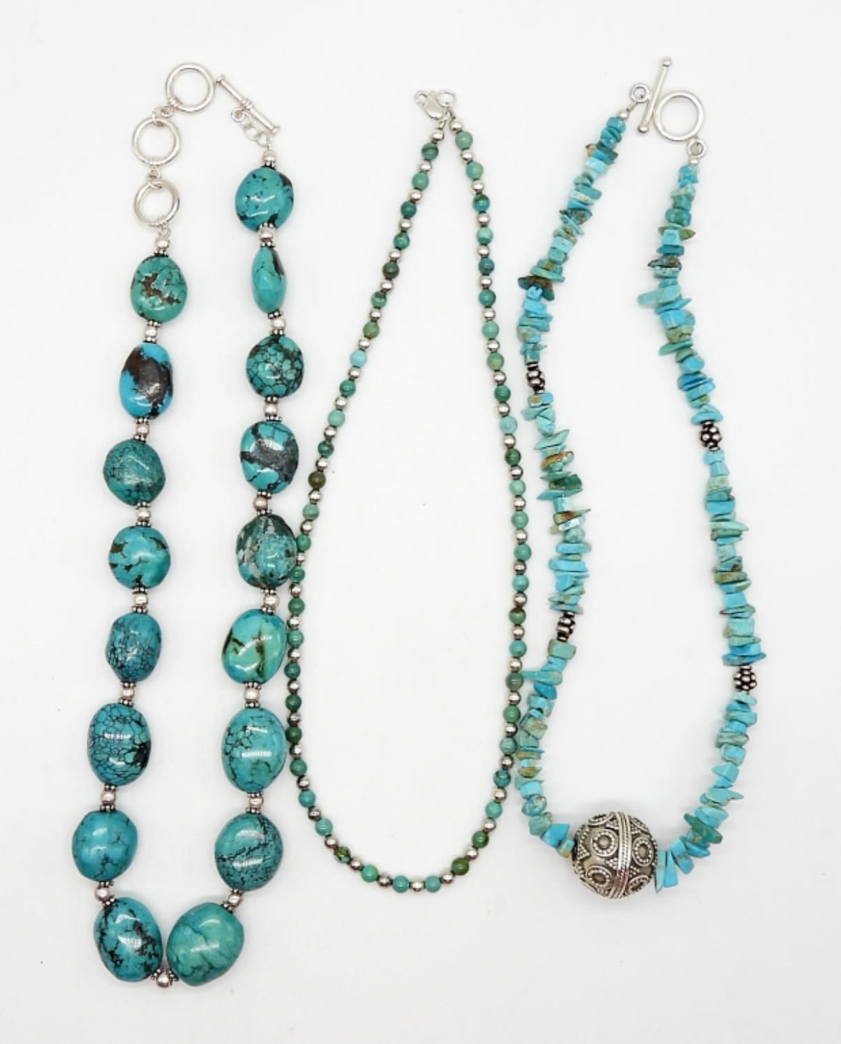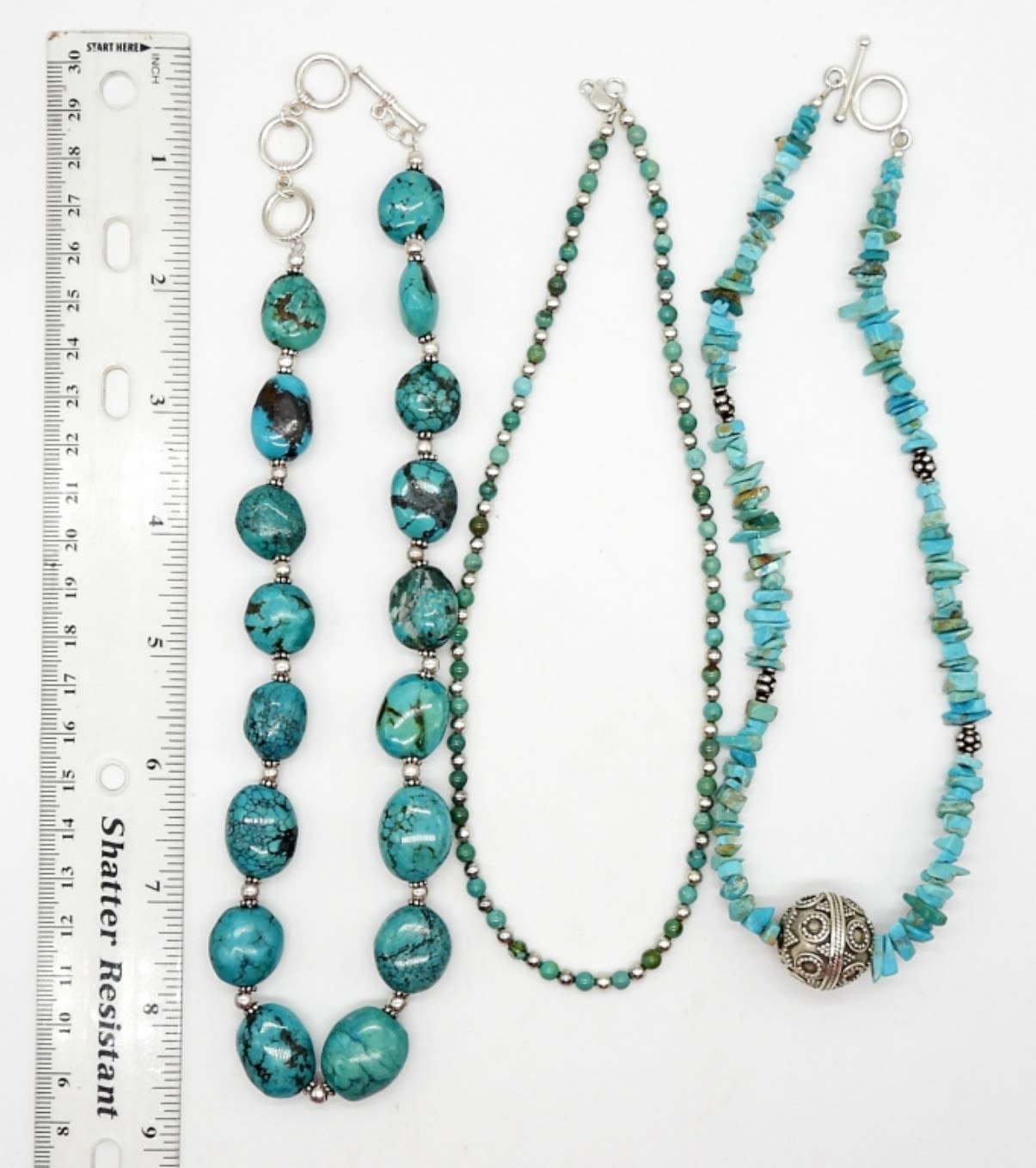 (3) 16″ & 17″ STERLING CHOKERS, LARGE & SMALL TURQUOISE BEADS, MARKED 925