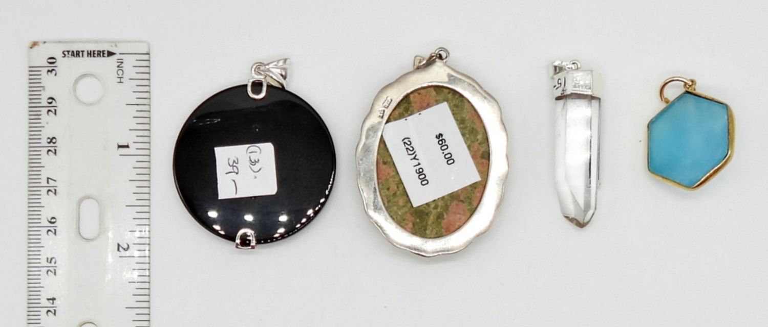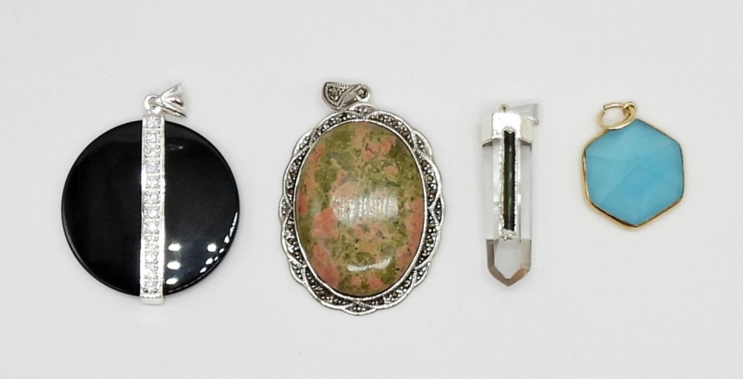 (4) STERLING PENDANTS WITH NATURAL STONES, CRYSTAL & RHINESTONES; (2) MARKED 925)