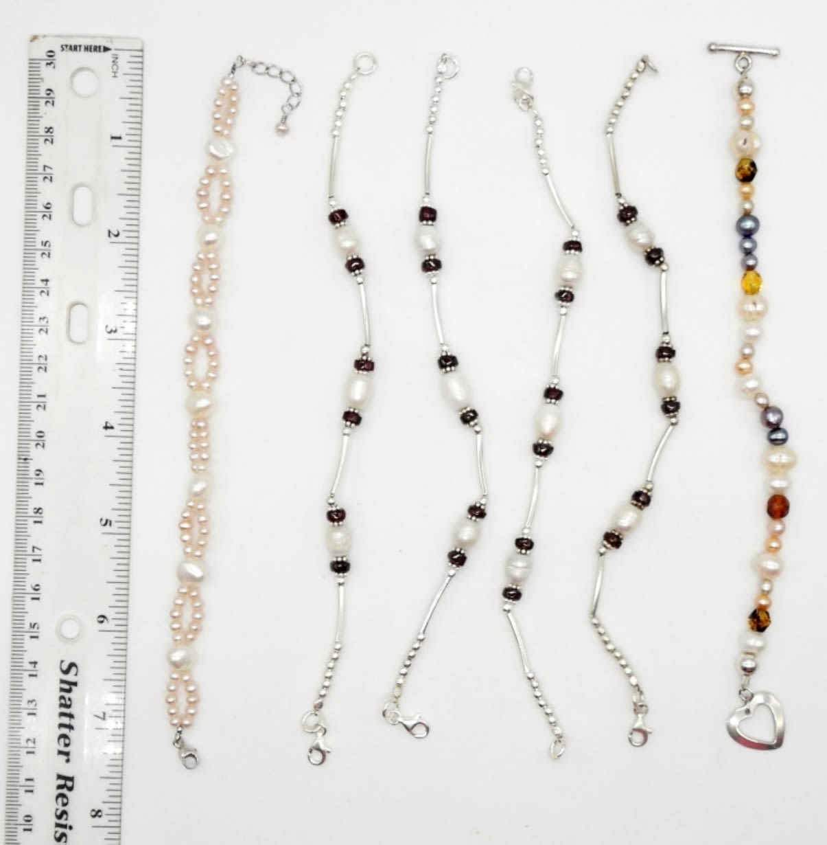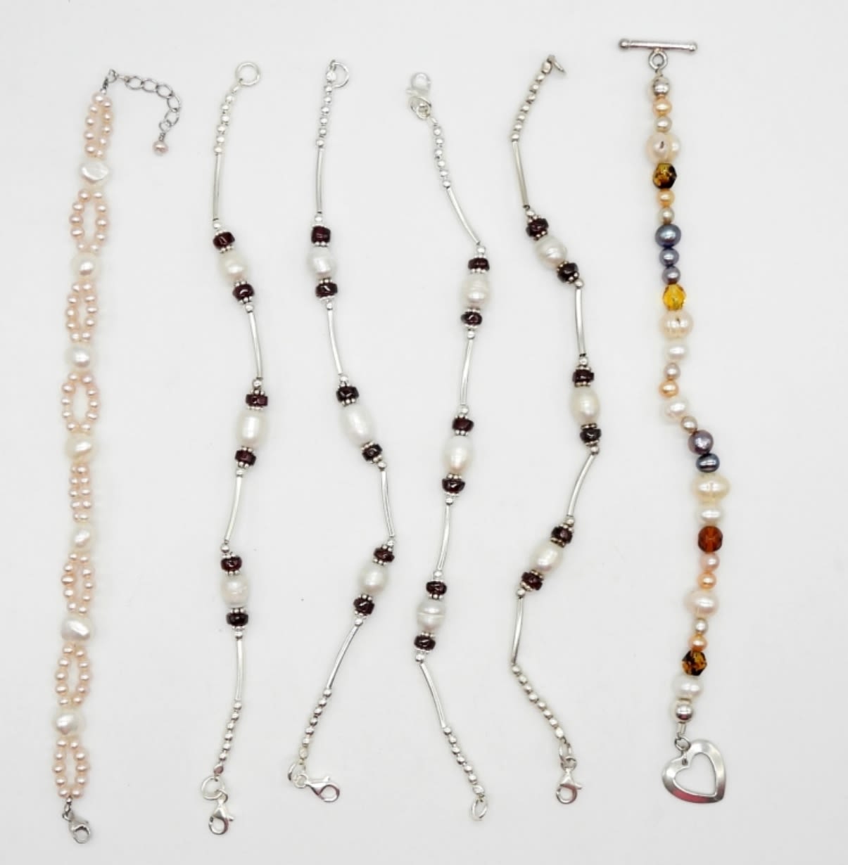 (6) 7″ STERLING & BEADED BRACELETS, MOTHER OF PEARL, AMBER; (5) MARKED 925