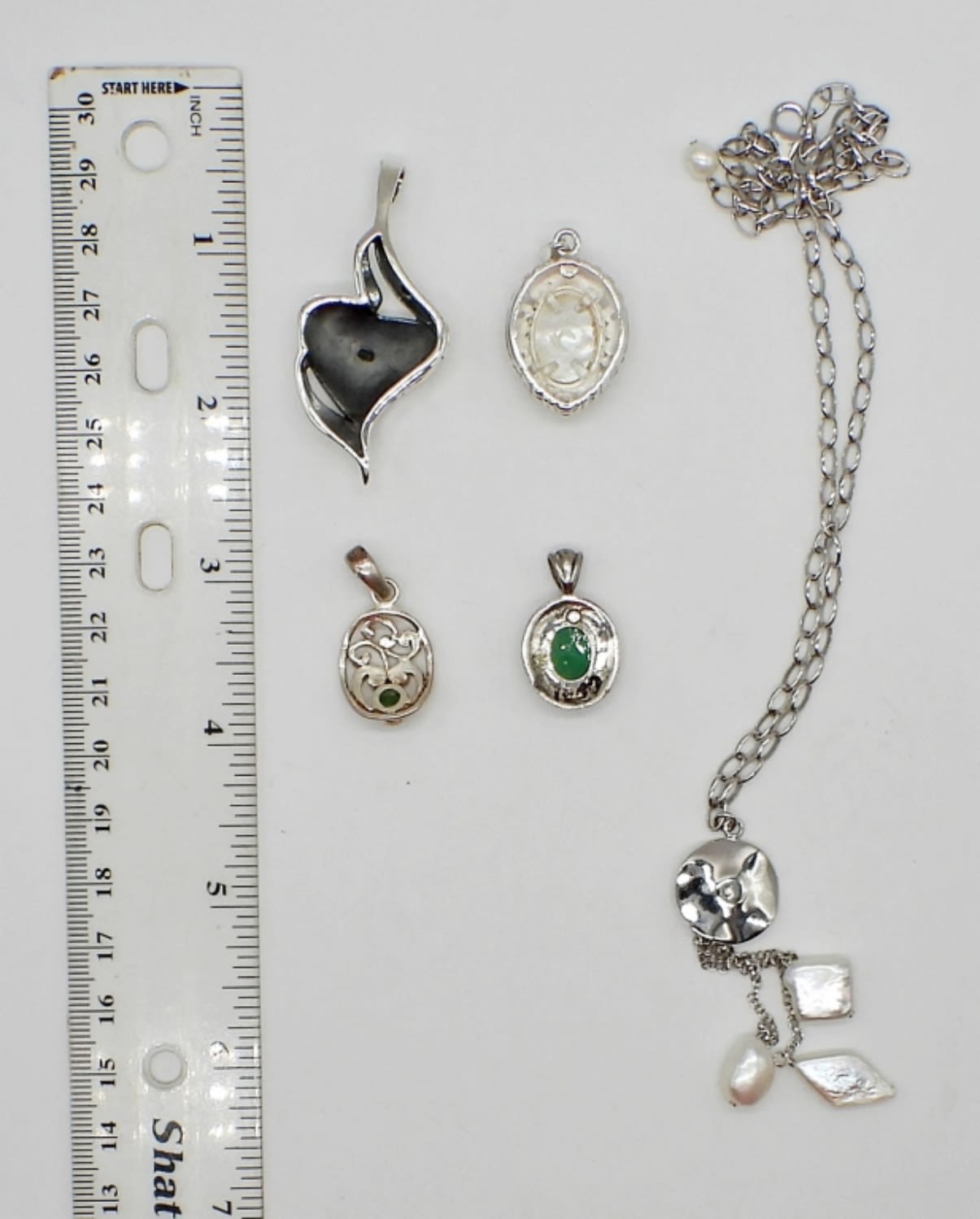19 DWT; (4) STERLING PENDANTS WITH NATURAL STONES; 18″ STERLING NECKLACE WITH MOTHER OF PEARL – ALL MARKED 925