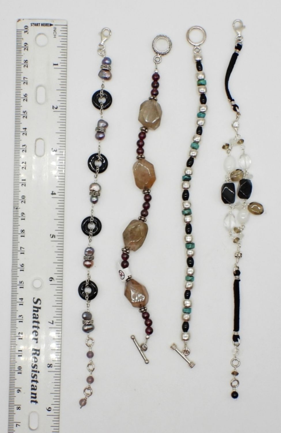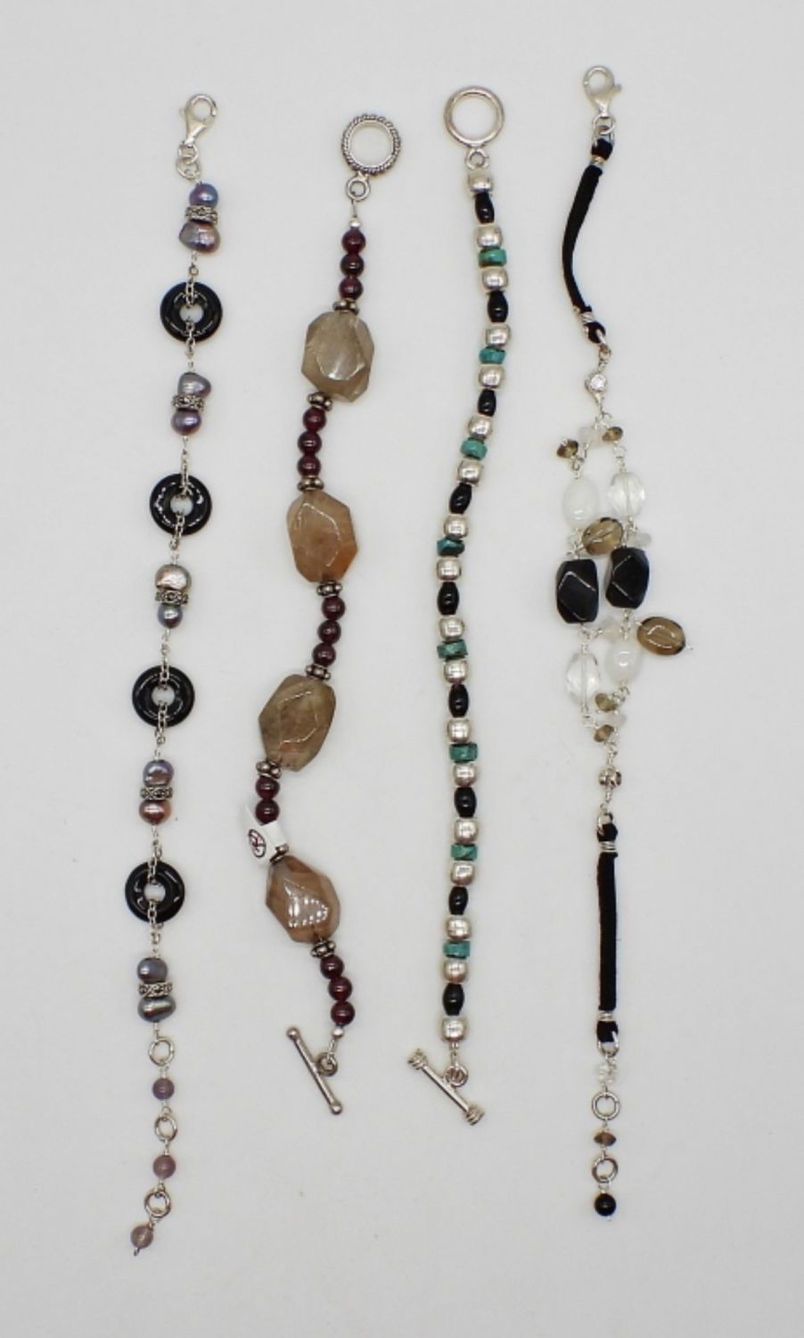 (4) STERLING BRACELETS 7.5″-9″; TURQUOISE, ONYX & MARCASITE – (3) MARKED 925