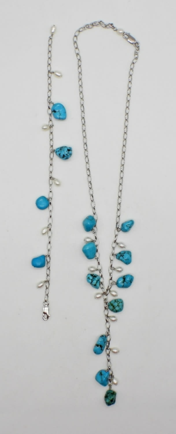 STERLING TURQUOISE & PEARL MATCHING 8″ BRACELET & 18″ NECKLACE – BOTH MARKED 925