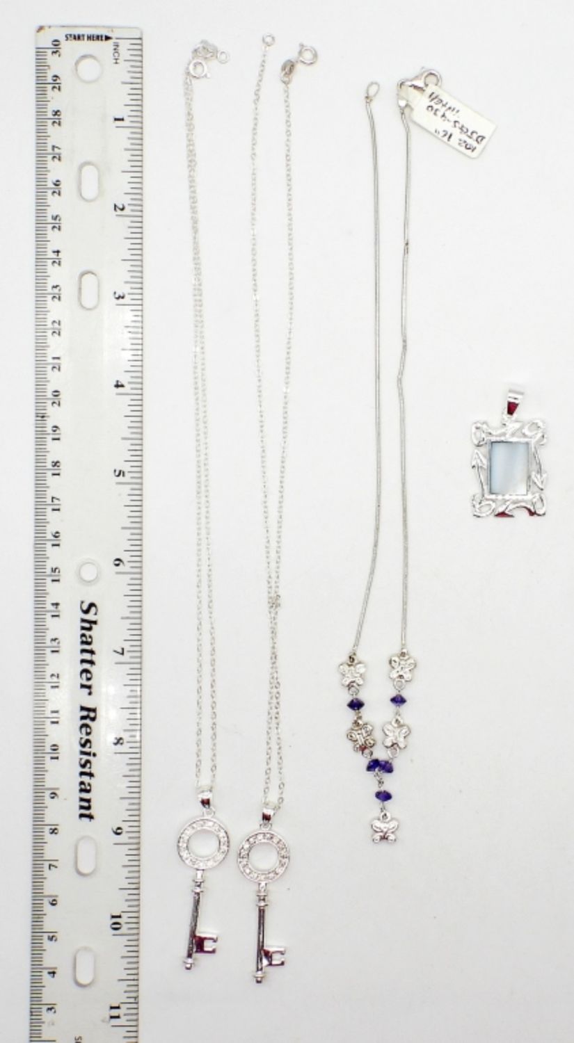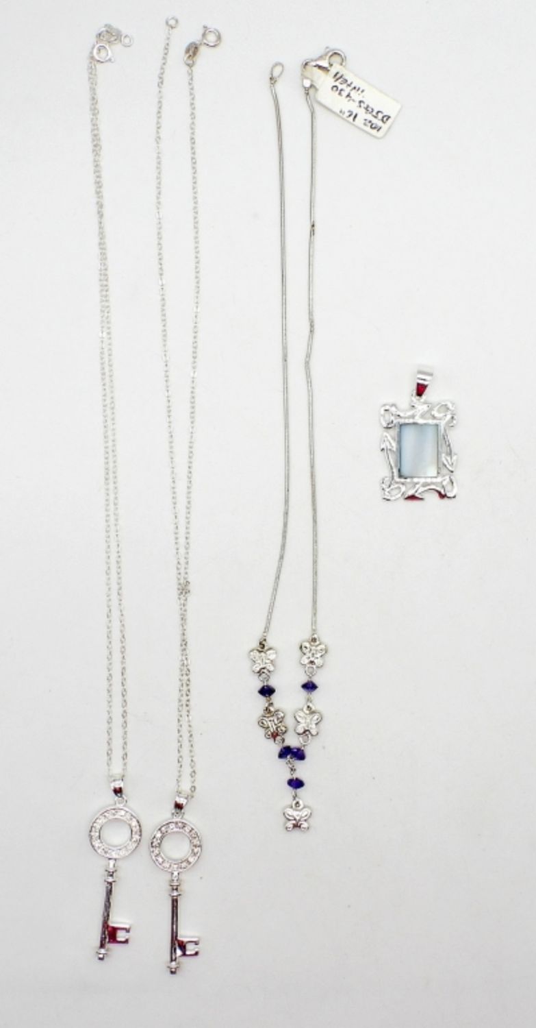 14 DWT; (3) STERLING NECKLACES WITH PURPLE & CLEAR GEMSTONES; (1) STERLING PENDANT WITH LIGHT BLUE NATURAL STONE – MARKED 925