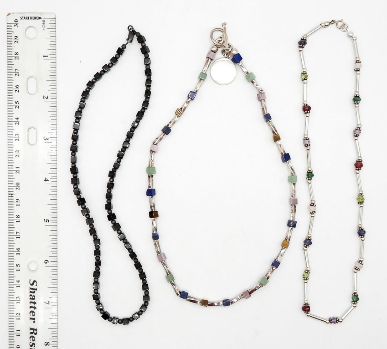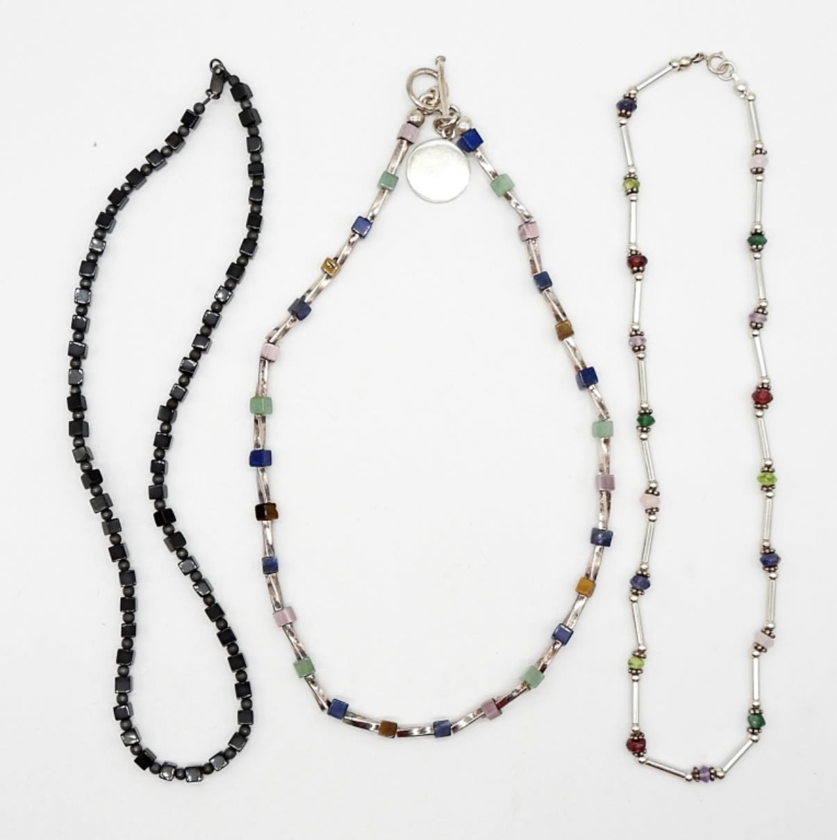 (3) STERLING CHOKERS WITH BLACK ONYX, STERLING SILVER & MULTI COLOR BEADS – (1) MARKED 925