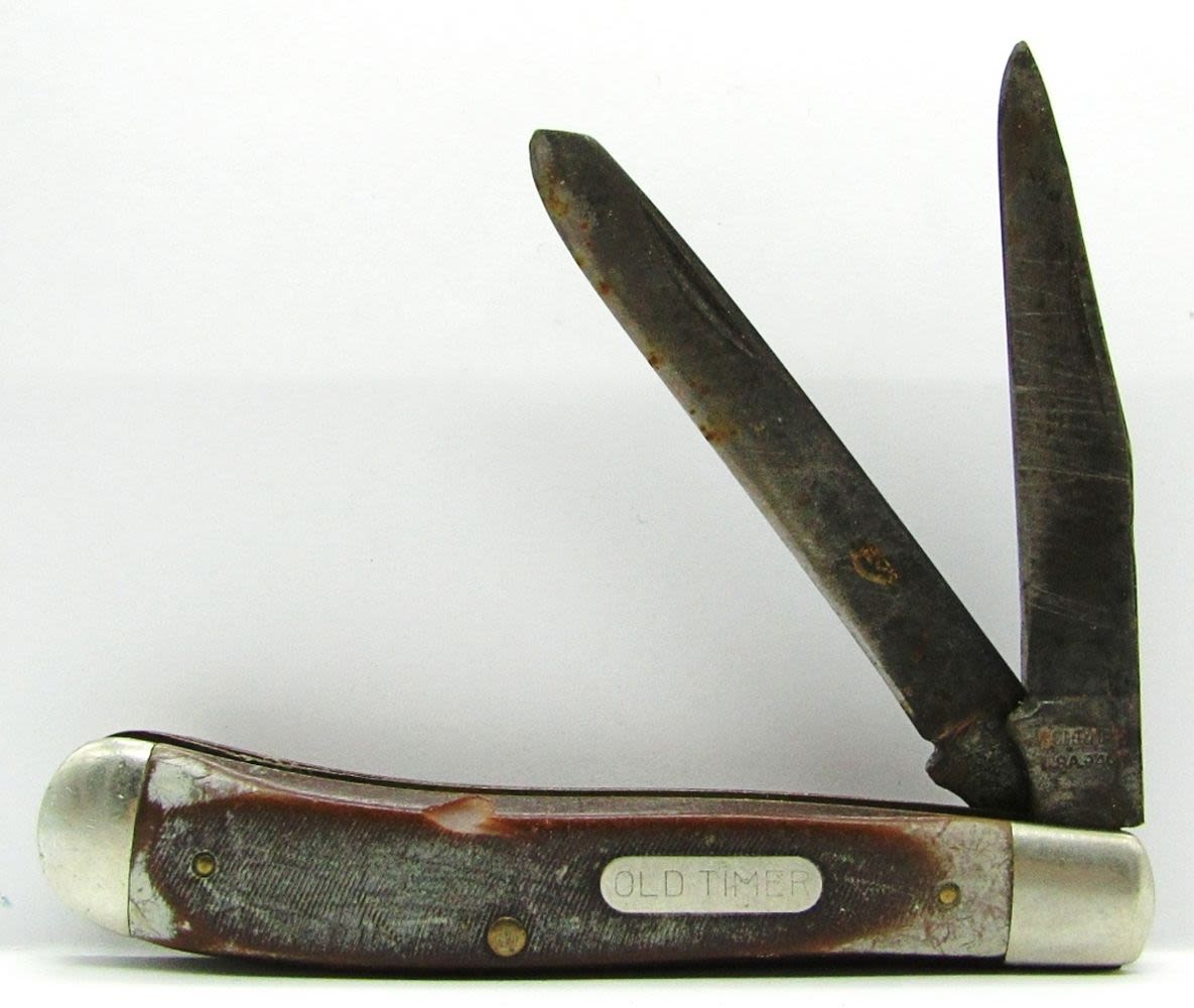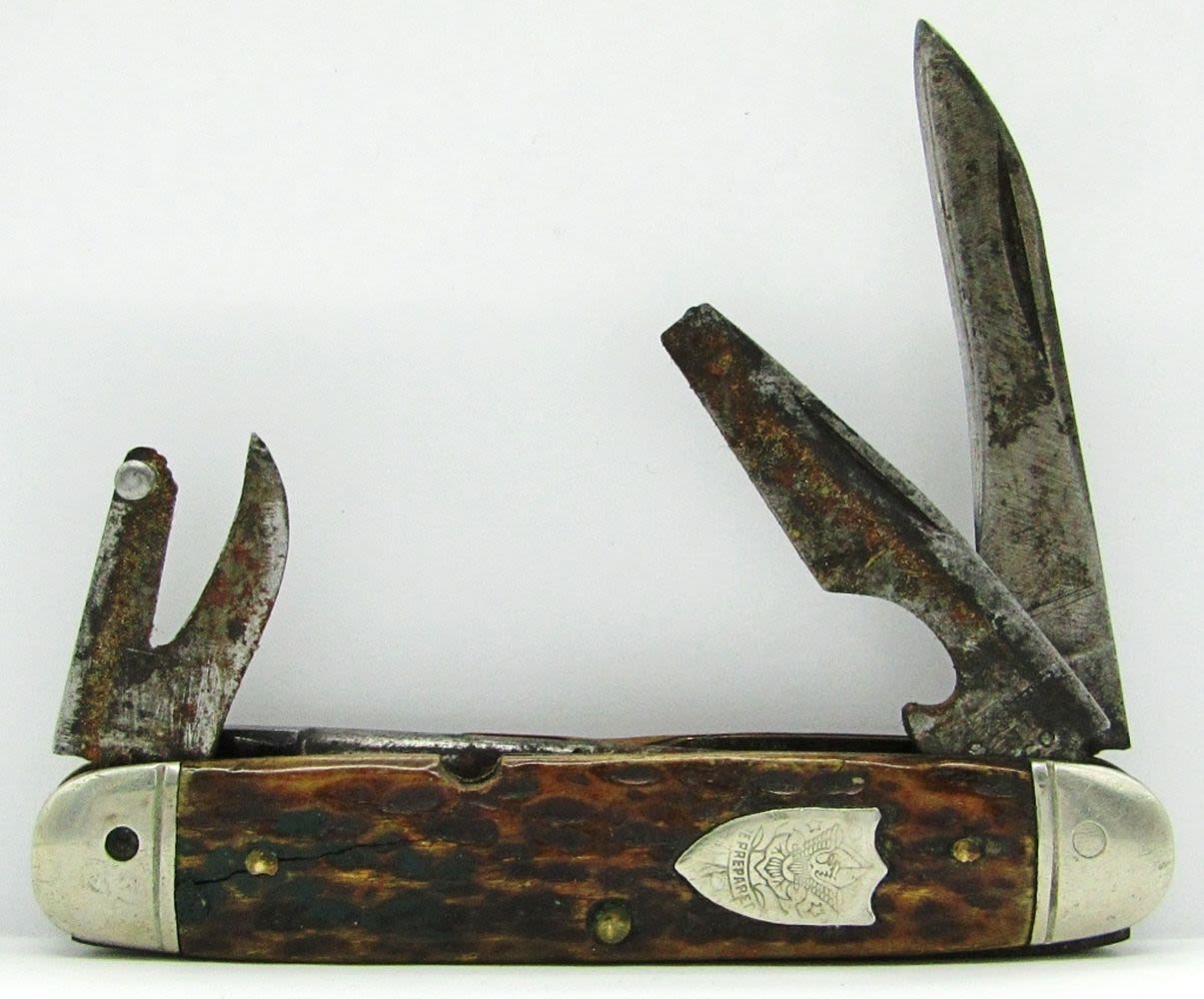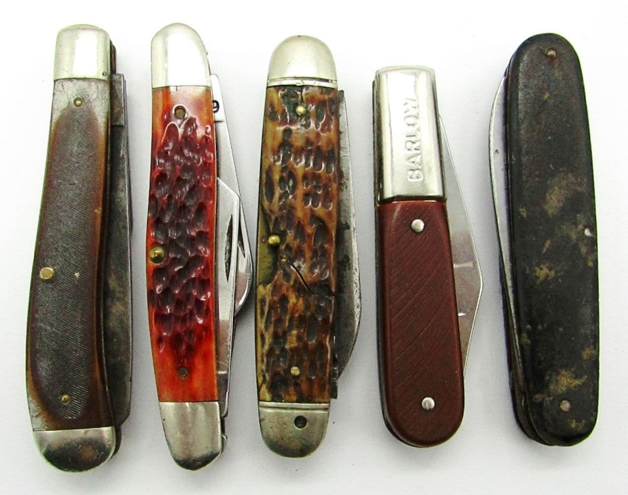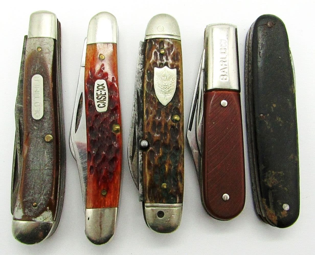 2-Blade Old Timer Schrade 94OT; “Be Prepared” Boy Scouts Ulster Knife Co.; 3-Blade CaseXX 2-Dot 6347SS; Cosmo MFG Co. Germany Joseph Feist; Barlow Imperial Ireland; Used Conditions.