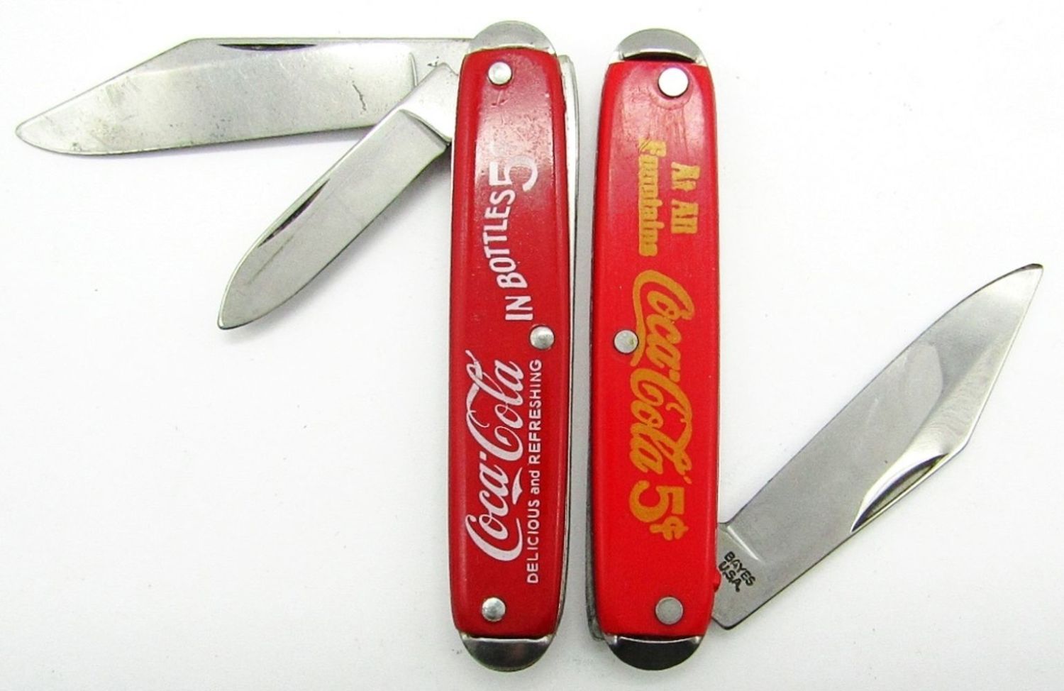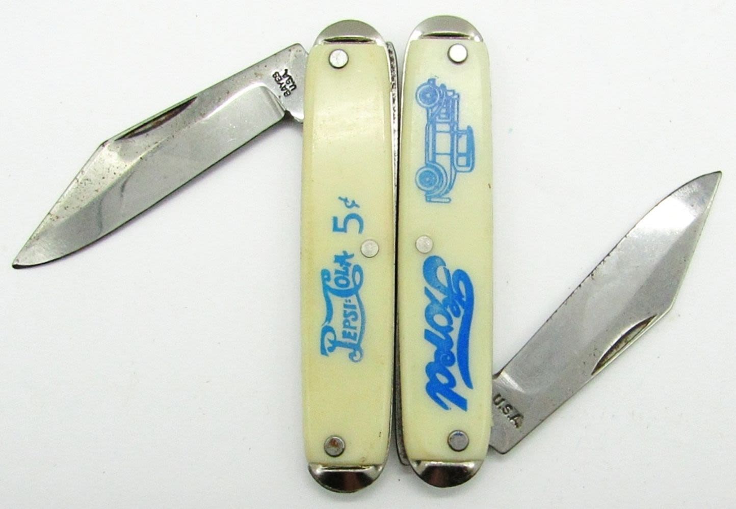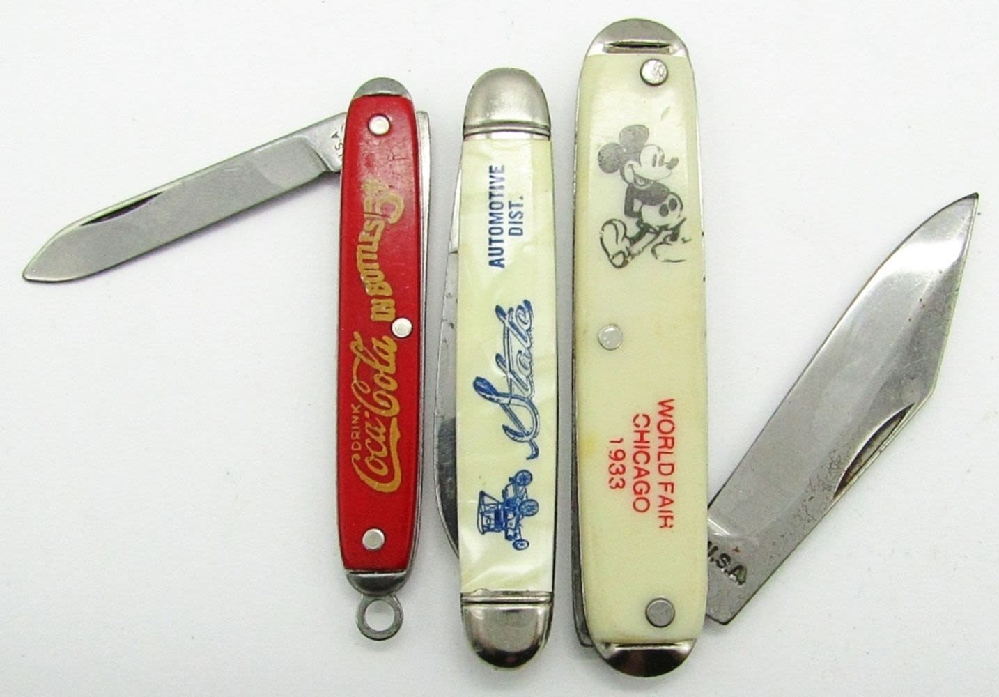 Single Blade USA “Drink Coca-Cola in Bottles 5C”; Single Blade Bayes USA “At All Fountains Coca-Cola 5C”; 2-Blades USA “Coca-Cola Delicious and Refreshing in Bottles 5C”; Single Blade Bayes USA “Pepsi-Cola 5C”; Single Blade USA Mickey Mouse “World Fair Chicago 1933”; Single Blade Imperial Prov. RI “State Automotive Dist.”; Single Blade USA “Ford”; Used Condition.