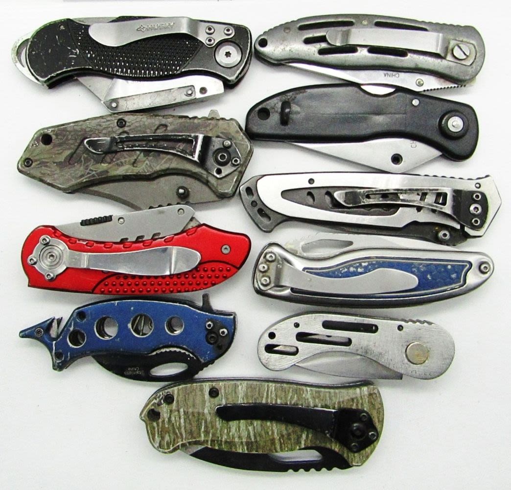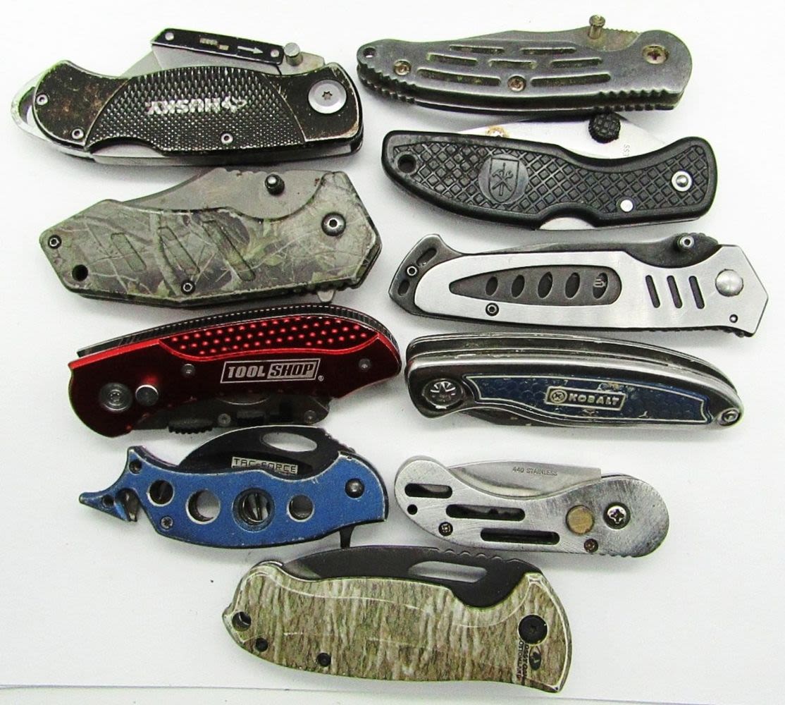 1 BLADE SMITH & WESSON, 1 BLADE MOSSY OAK, 1 BLADE TAC-FORCE STAINLESS, 1 BLADE KOBALT, 1 BLADE TOOLSHOP, 1 BLADE HUSKEY, 1 BLADE STAINLESS X2, 1 BLADE BARRACUDA ROSTFREI, 1 BLADE UNMARKED, USED CONDITION