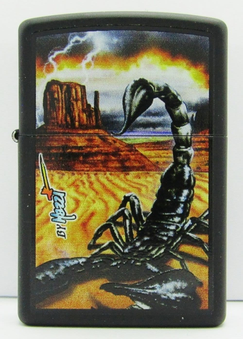 Black Matte Finish Zippo Lighter – Scorpion in Desert with Lightning; New, Unfired Zippo Lighter.