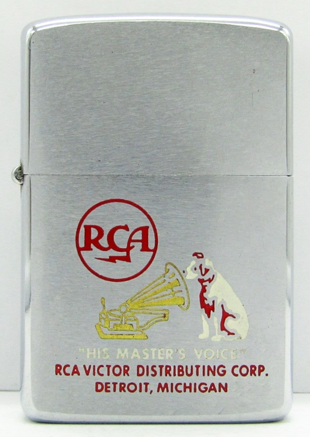 “RCA His Master’s Voice RCA Victor Distributing Corp. Detroit, Michigan”; Unfired Zippo Lighter.