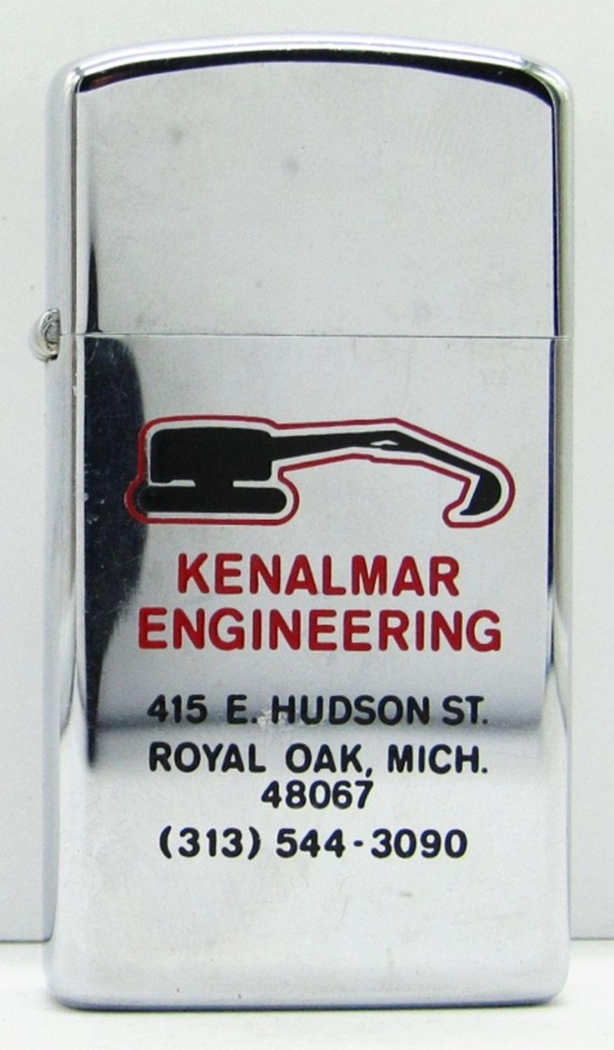 “Kenalmar Engineering 415 E. Hudson St Royal Oak, Mich 48067 (313) 544-3090”; Unfired Slim Zippo Lighter.