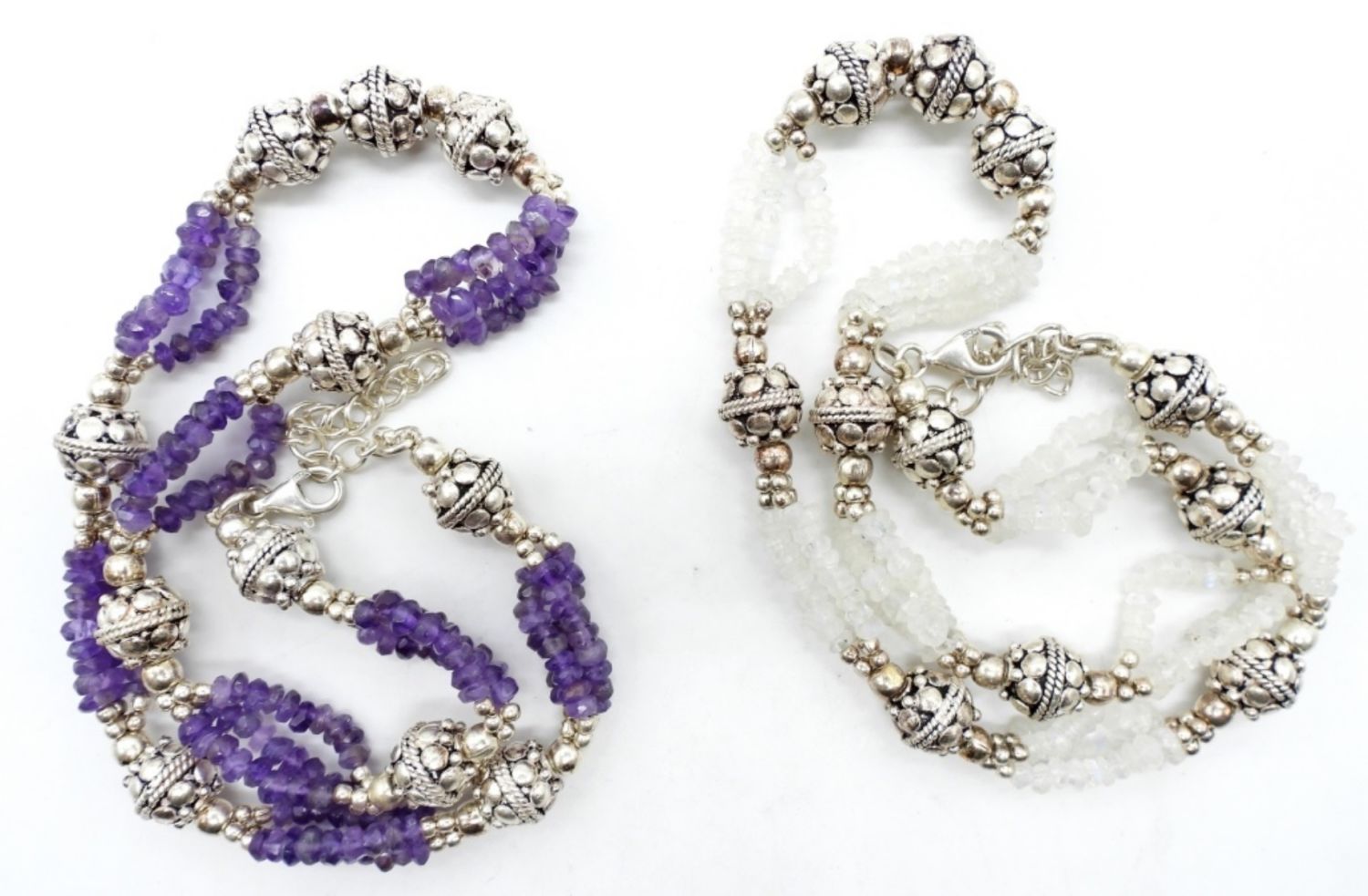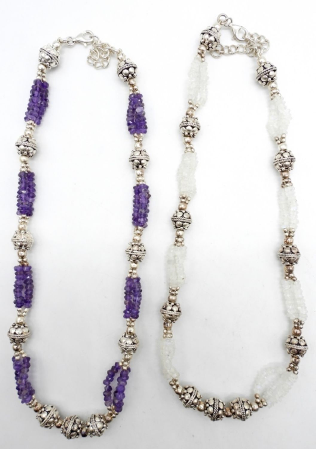 30DWT, 18IN LONG, 1 AMETHYST AND 1 MOONSTONE MINI CHUNK STONE WITH STERLING BEADING, LOBSTER CLASP STAMPED 925 ON CLASP, ADJUSTABLE