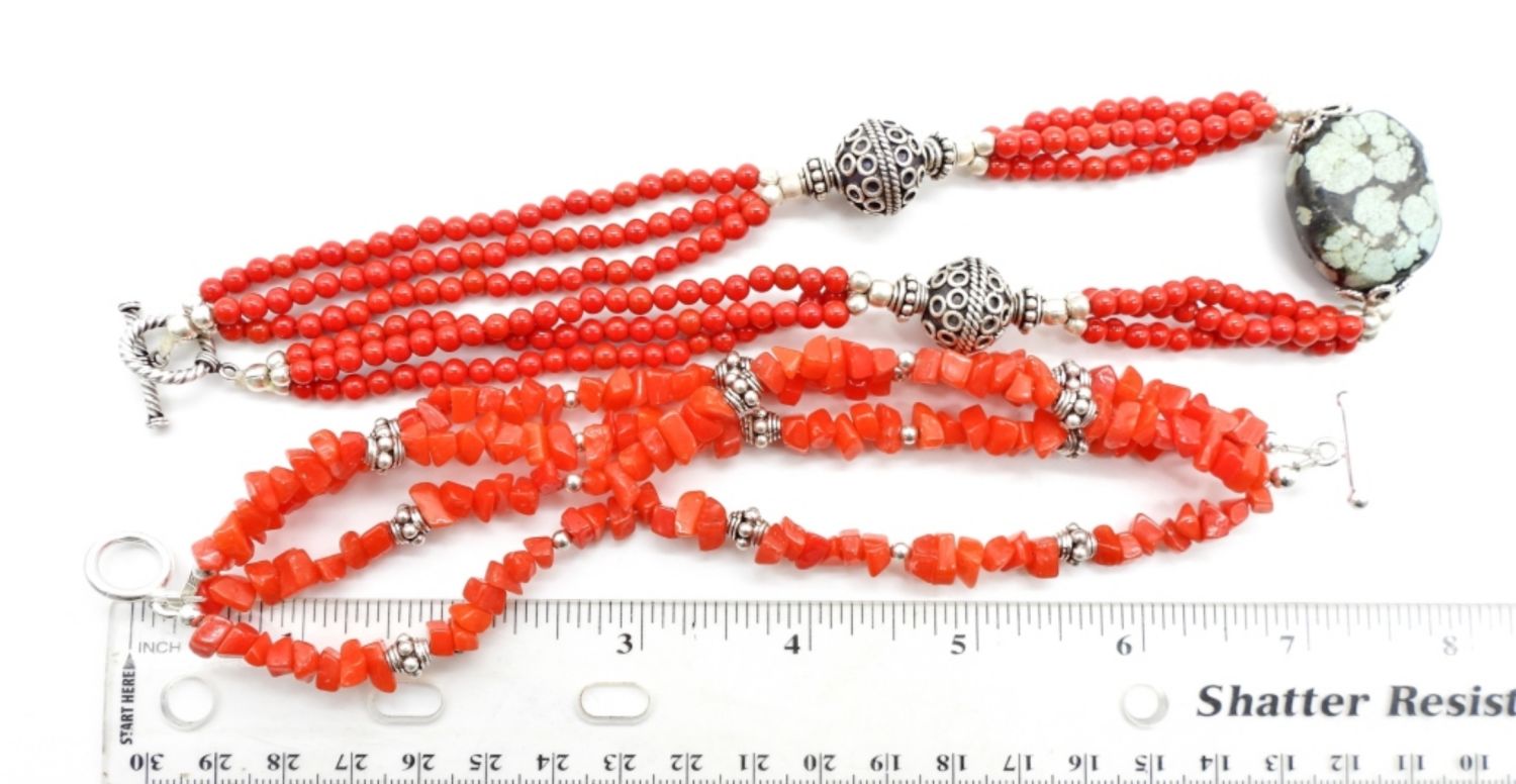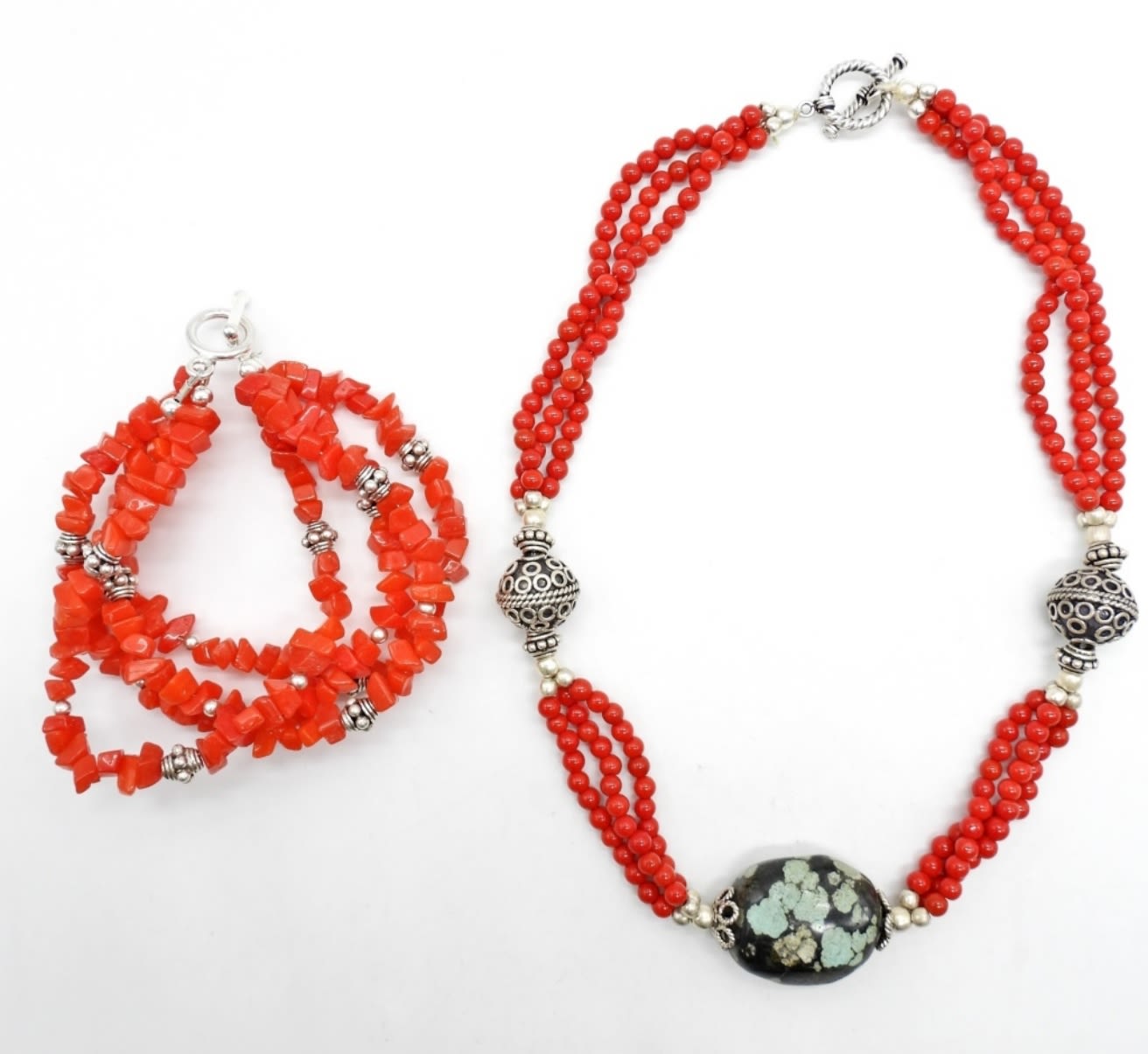 NECKLACE 16IN LONG, WITH STERLING AND CORAL BEADS WITH TURQUOISE STONE IN THE MIDDLE, TOGGLE CLASP, NO STAMPING FOUND, BRACELET WITH STERLING BEADING, TOGGLE CLASP STAMPED 925