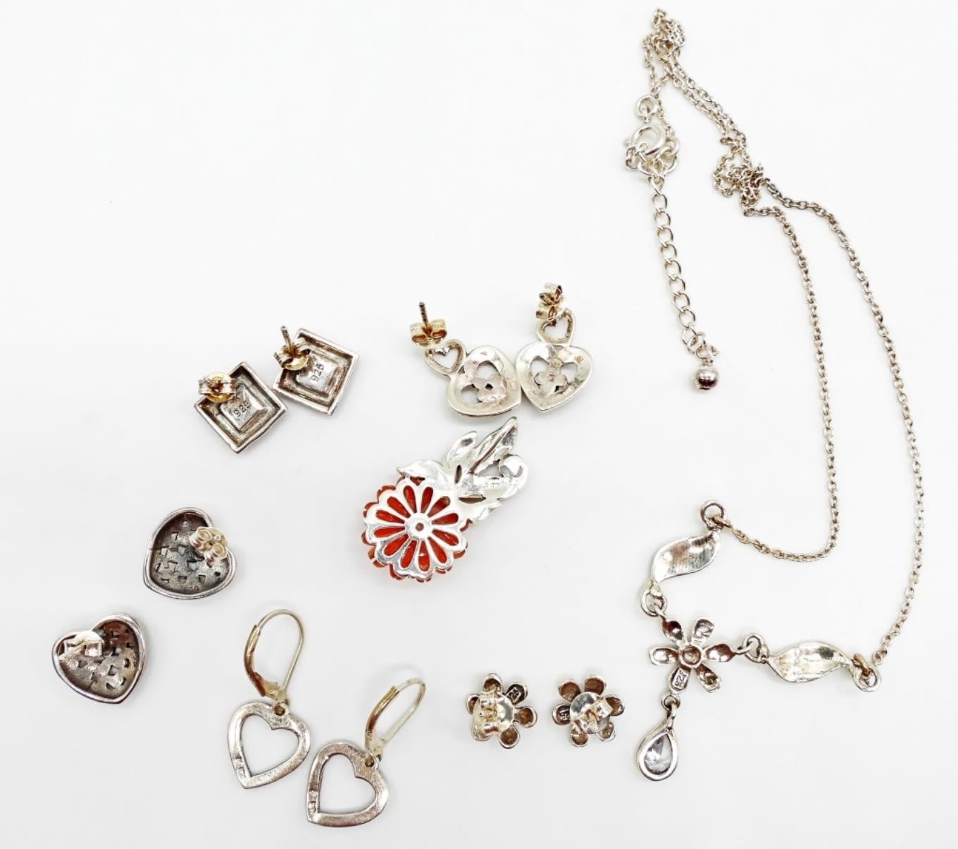 15DWT,5- PIERCED STUD EARRINGS, 1 SMALL NEAR 1 1/2IN LONG PENDANT, 1 FESTOON NECKLACE 18IN LONG, ADJUSTABLE, ALL ITEMS STAMPED 925