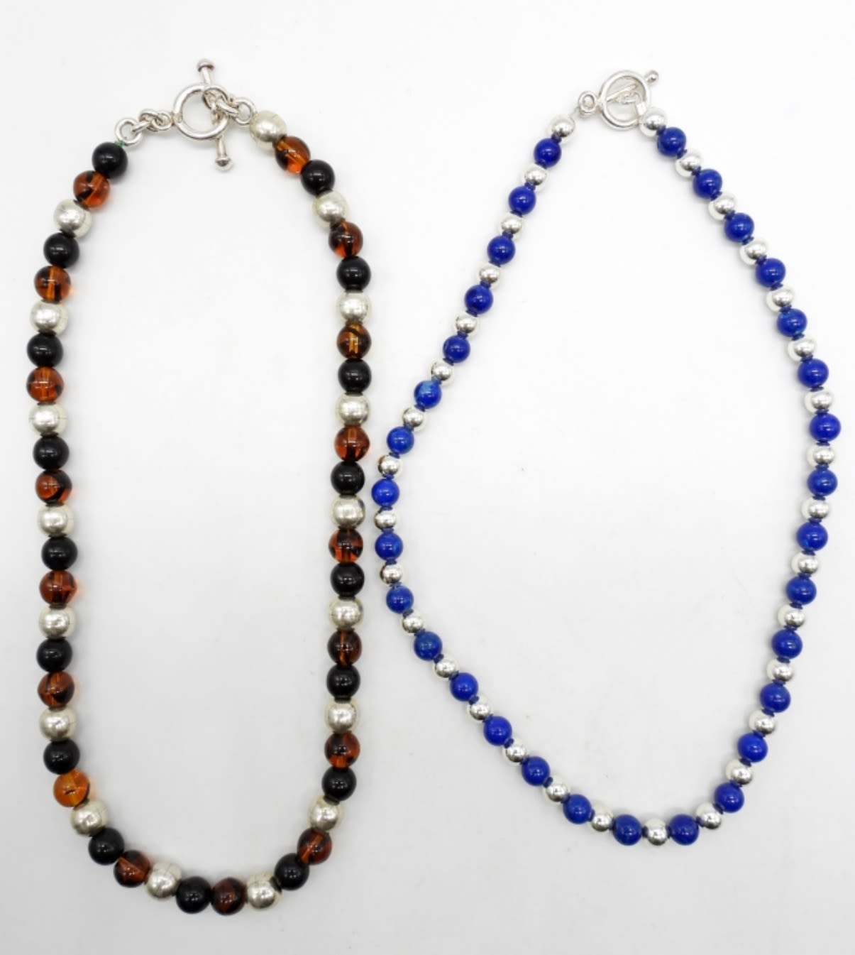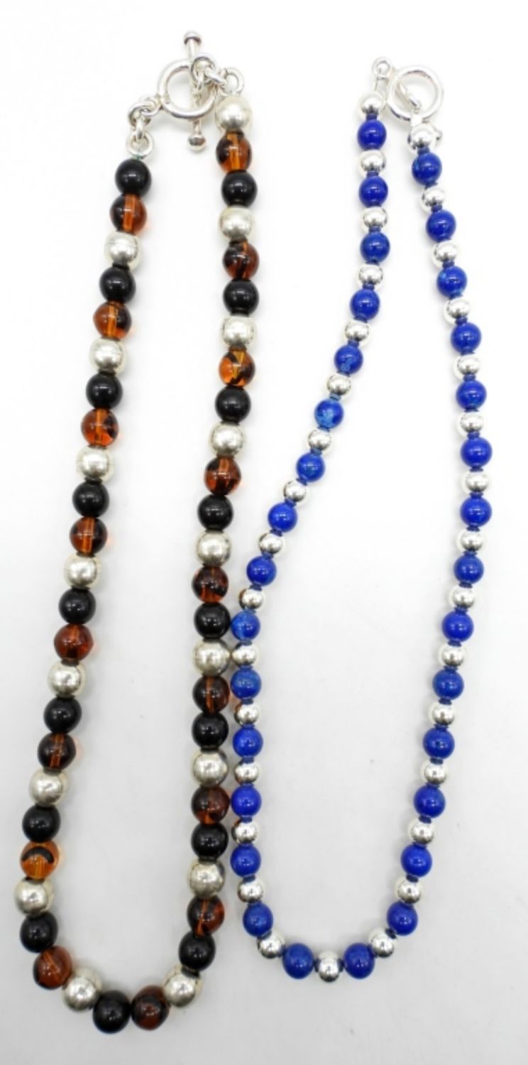 1 17IN LONG, BROWN AND STERLING BEADS, 16IN LONG BLUE AND STERLING BEADING, BOTH WITH TOGGLE CLASP STAMPED 925