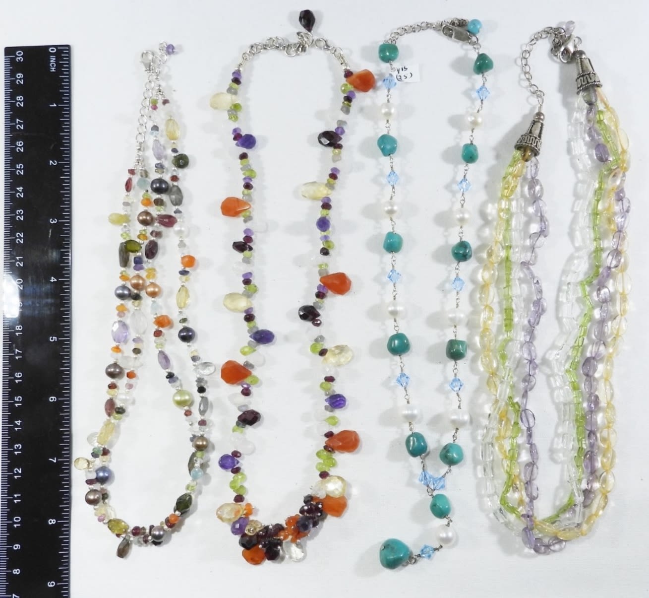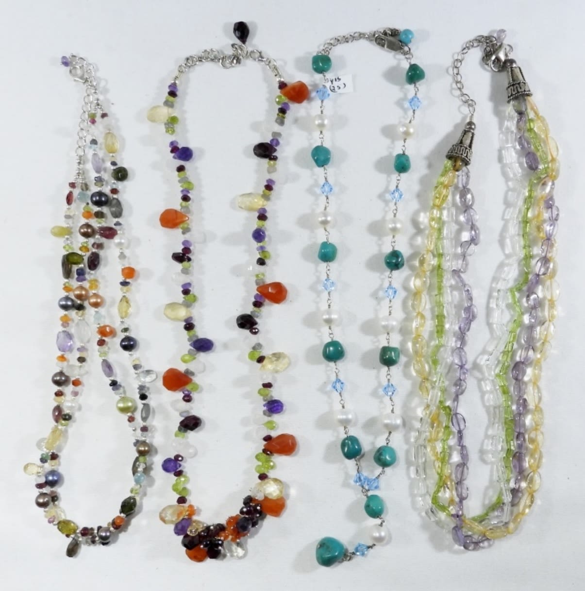 LARGE TURQUOISE BEADS, MOTHER OF PEARL, MULTI COLOR BEADS LARGE & SMALL, STERLING CHAINS18″-21″