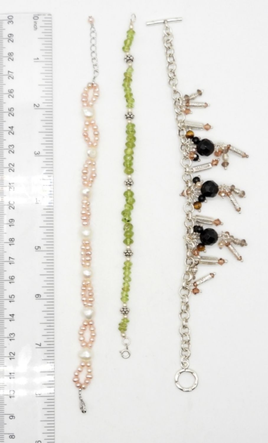 8″ STERLING & BEADED BRACELETS WITH MOTHER OF PEARL, ONYX, & GEMSTONES