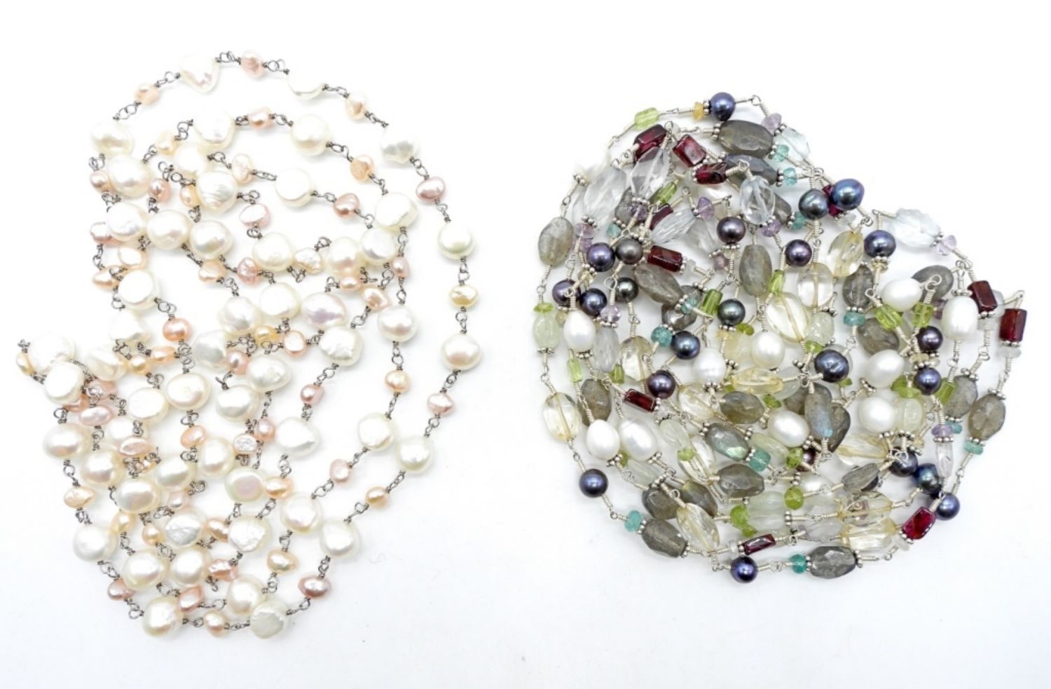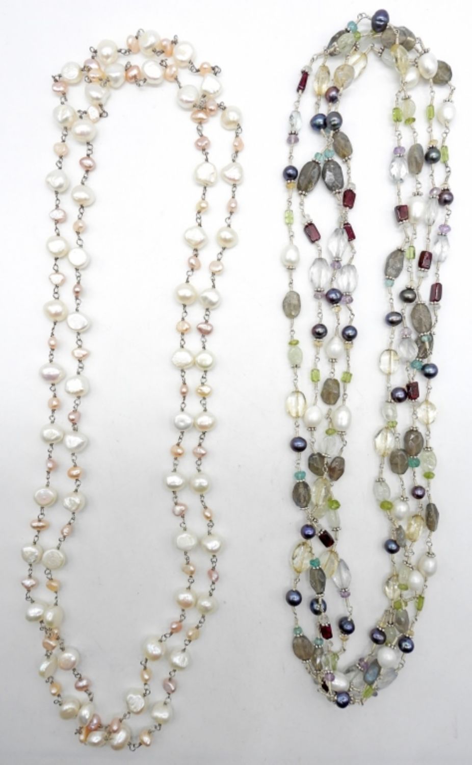 1 24IN LONG PEARL BEADS, 1 44IN LONG WITH COLOR BEADS AND MOTHER OF PEARL BEADS, NO STAMPINGS NO CLASP