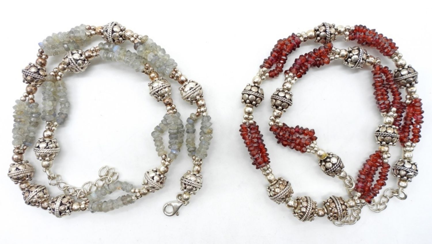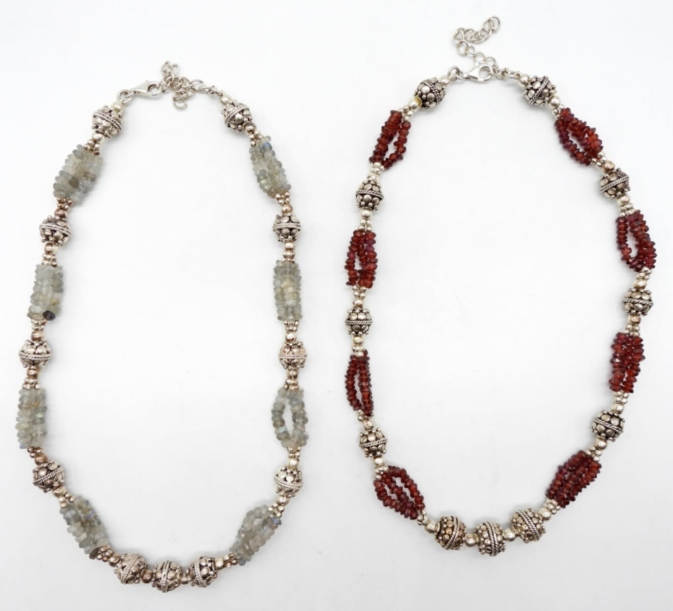 30DWT, 18IN LONG, 1 RED AND 1 MOONSTONE MINI CHUNK STONE WITH STERLING BEADING, LOBSTER CLASP STAMPED 925 ON CLASP, ADJUSTABLE