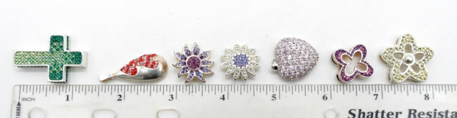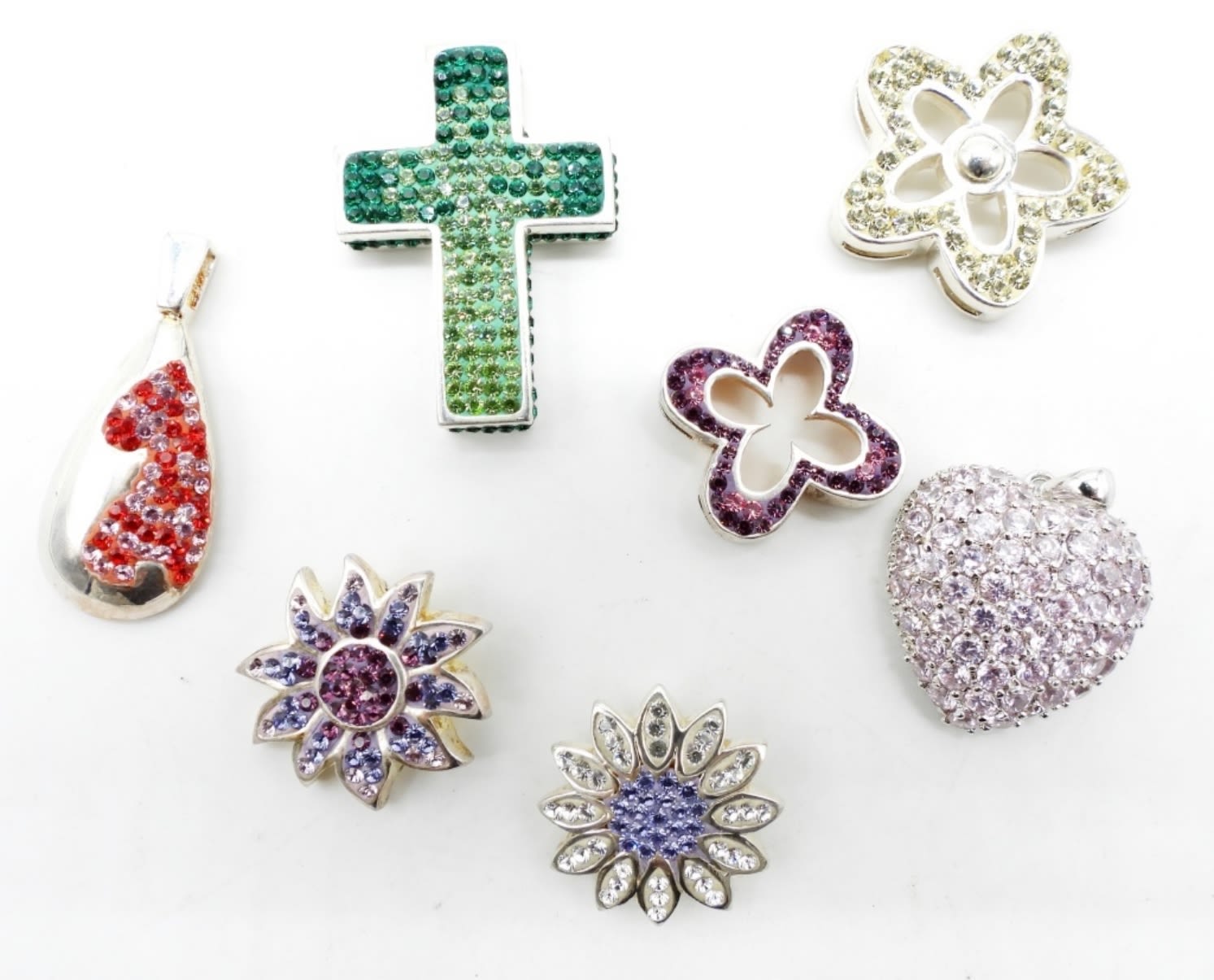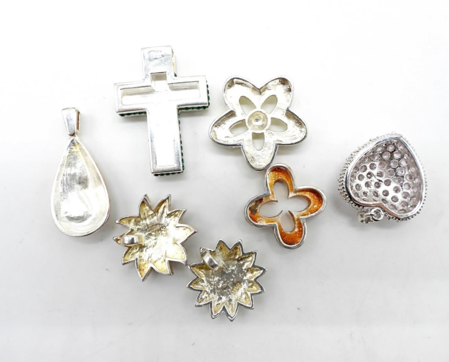 25.7DWT, BETWEEN 1 TO 1 1/2IN LONG, 4 FLOWERS, 1 HEART, 1 CROSS, 1 TEARDROP, STAMPED 925 ON CHARMS ON THE BACK
