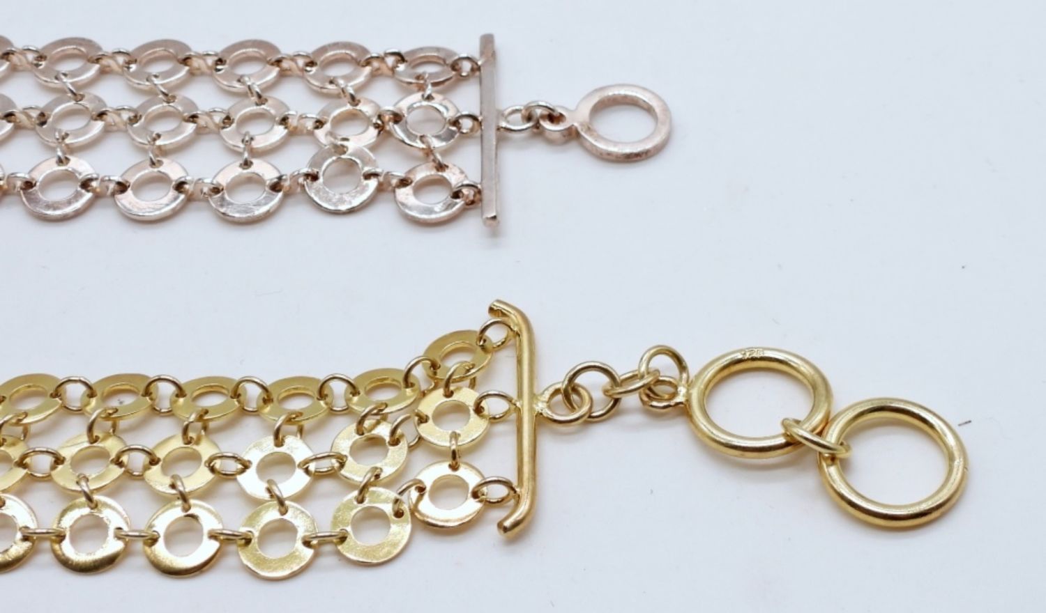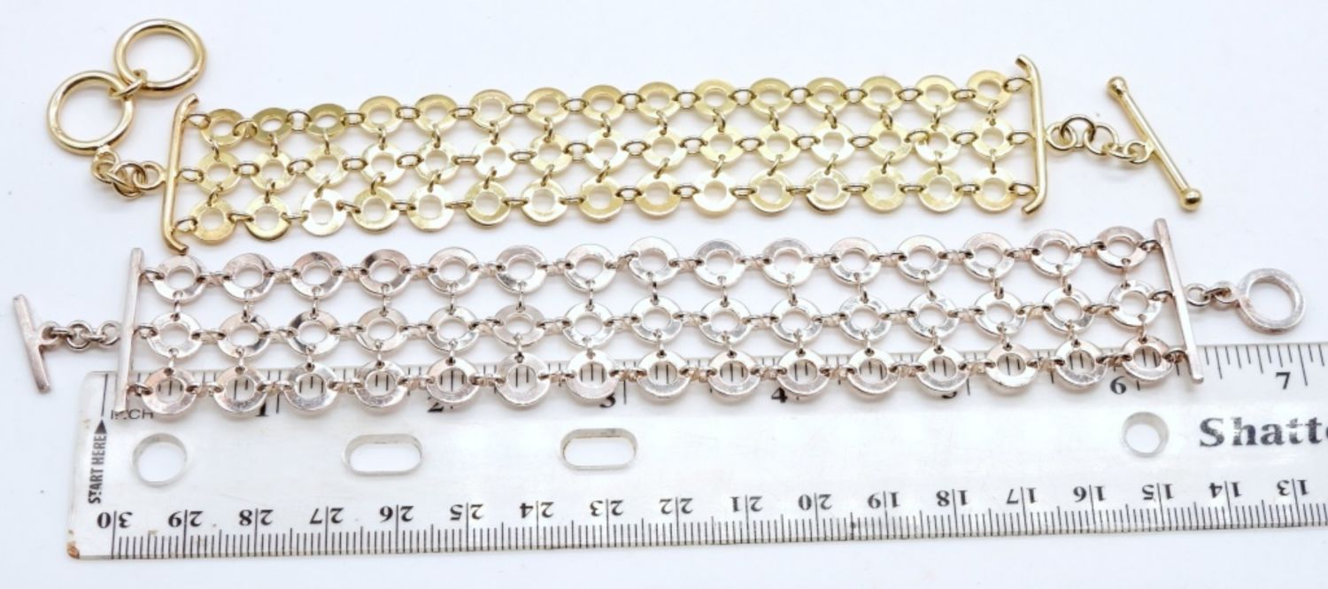 28 DWT, 1- 7 1/2IN LONG STERLING LAYERED BRACELET, 1- 8IN LONG STERLING GOLD PLATED LAYERED, BOTH HAVE TOGGLE CLASP STAMPED 925 ON PART OF THE CLASP