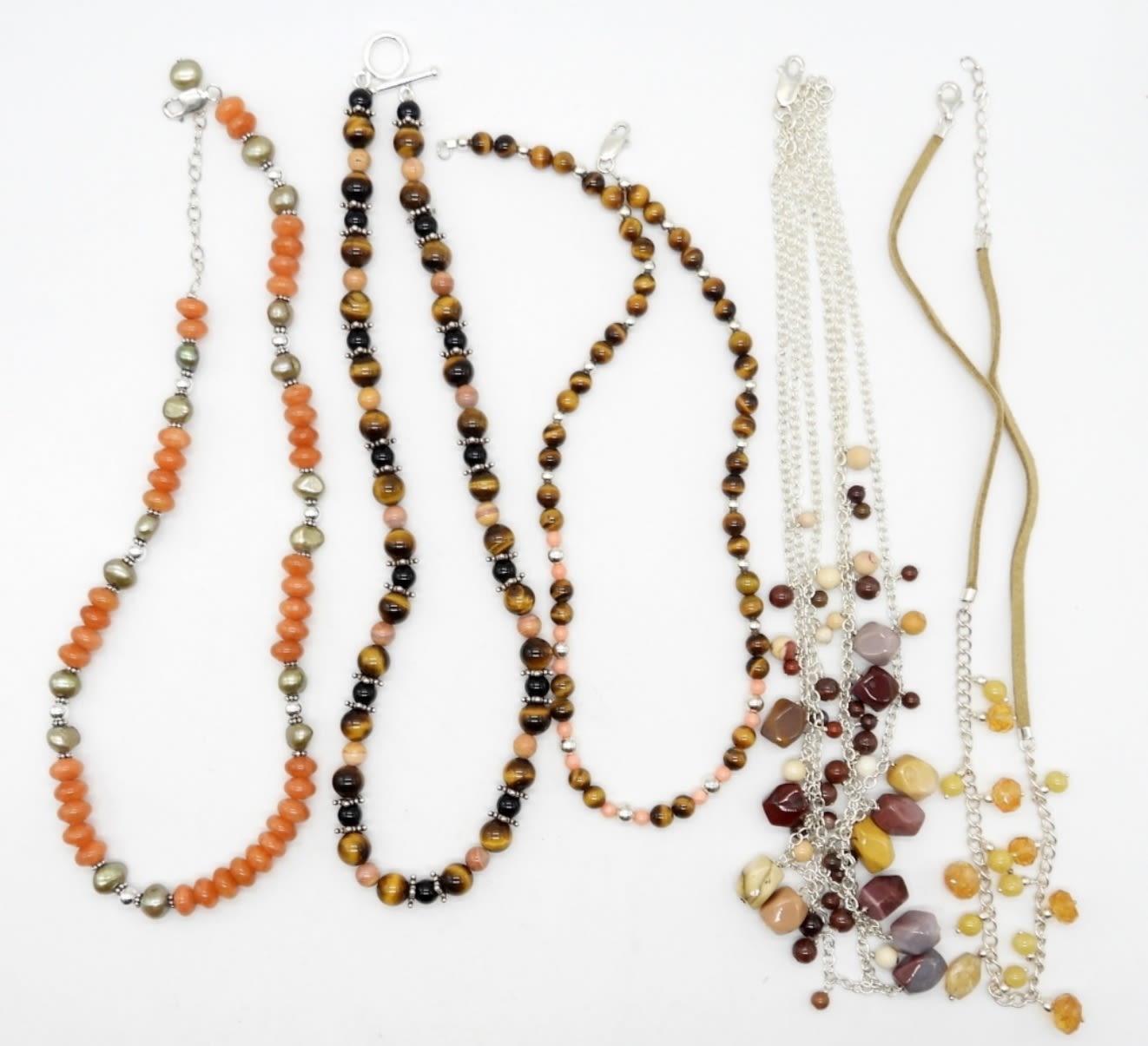 STERLING SILVER, NATURAL STONE BEADS, CATS EYE, MULTI COLOR; 16.5″-19″ LENGTHS; MARKED 925