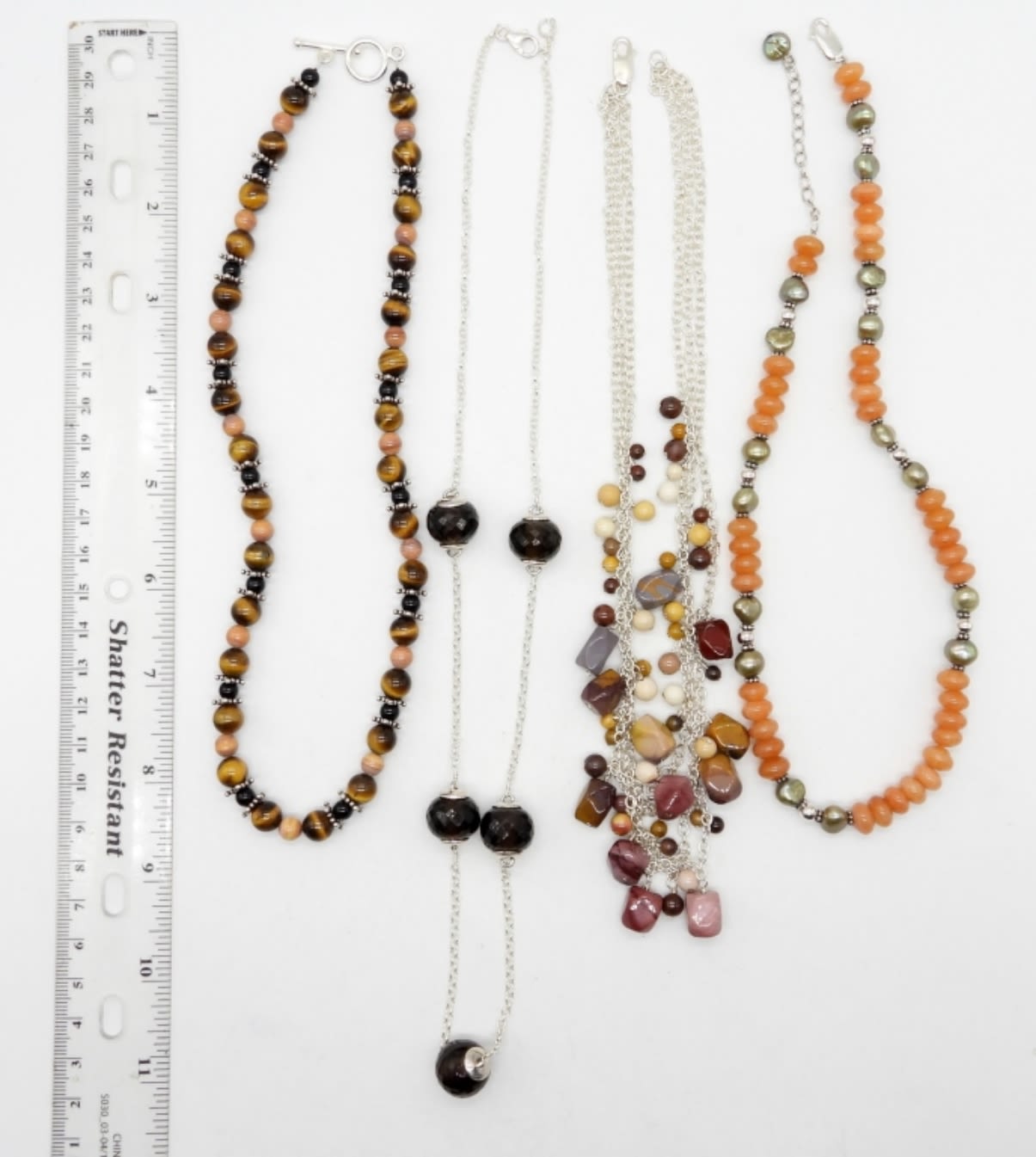 (3) 18″ NECKLACES & (1) 23″ NECKLACE; WITH CATS EYE, SMOKY QUARTZ & NATURAL STONES – ALL MARKED 925