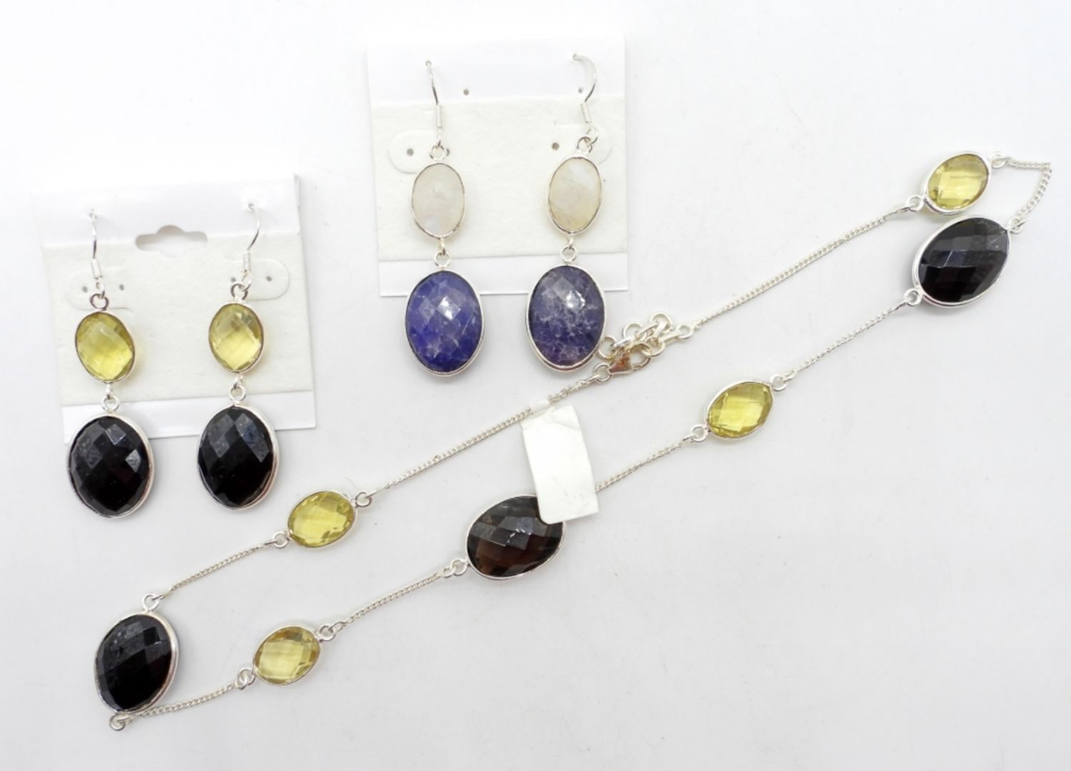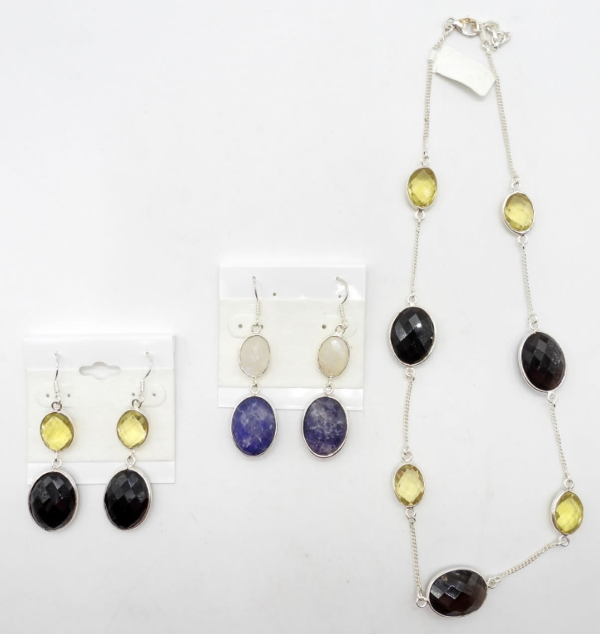 18″ STERLING SILVER NECKLACE WITH ETCHED NATURAL STONES & (2) PAIRS OF MATCHING EARRINGS – MARKED 925