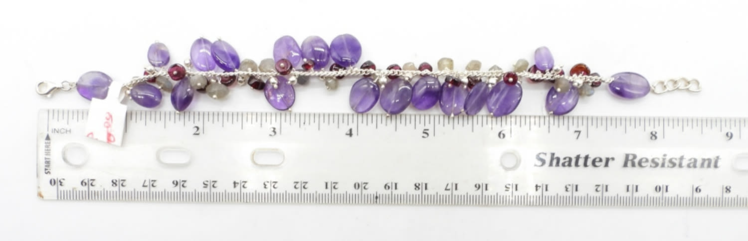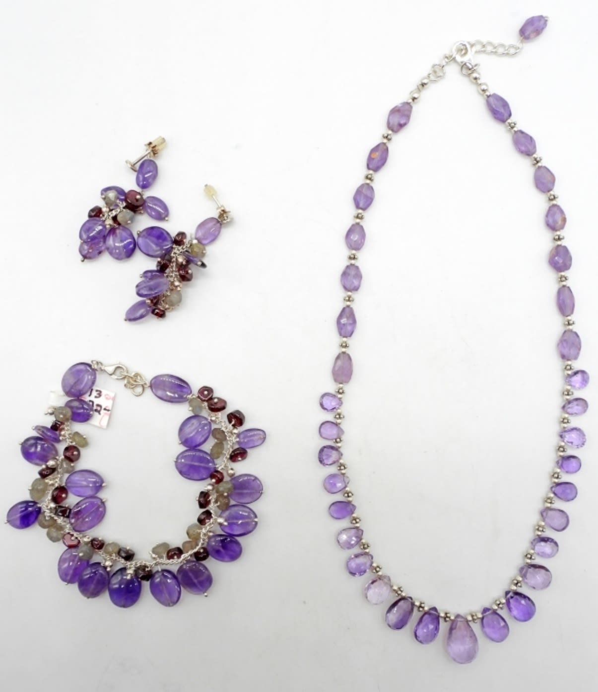 STERLING SILVER 18″ NECKLACE, 8″ BRACELET & PAIR OF EARRINGS WITH PURPLE NATURAL GEMSTONES