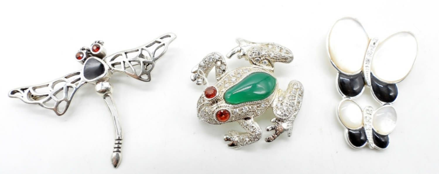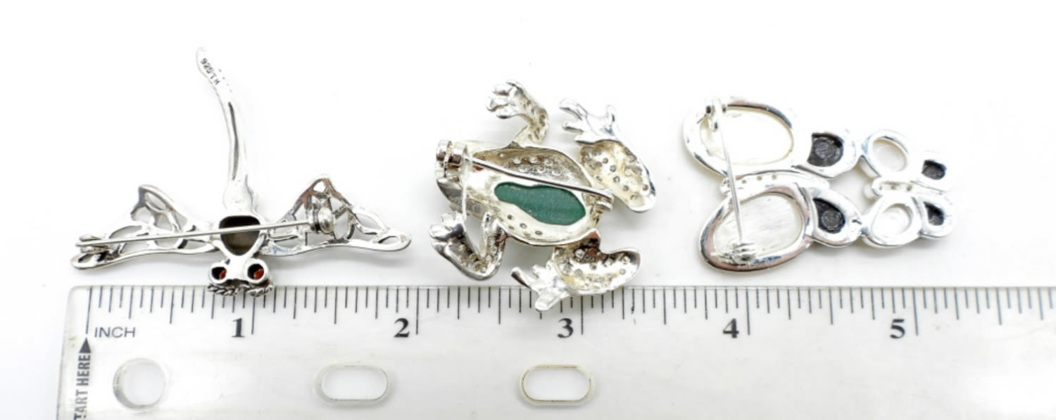 15.3DWT, DRAGONFLY WITH BLACK ONYX INLAY RED STONE EYES, 2IN LONG STAMPED 925, FROG 1 1/2IN LONG WITH GREEN INLAY AND RED STONE EYES AND CLEAR STONES, STAMPED 925, MOTHER OF PEARL AND BLACK ONYX INLAY BUTTERFLY, STAMPED 925 1 1/2IN LONG