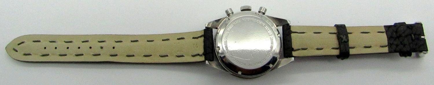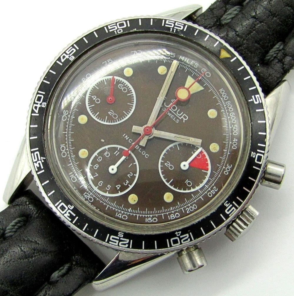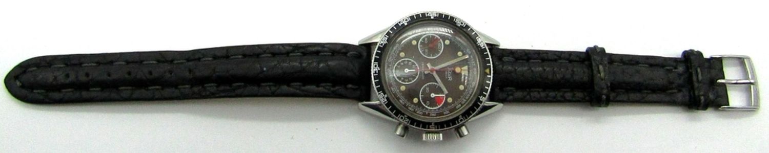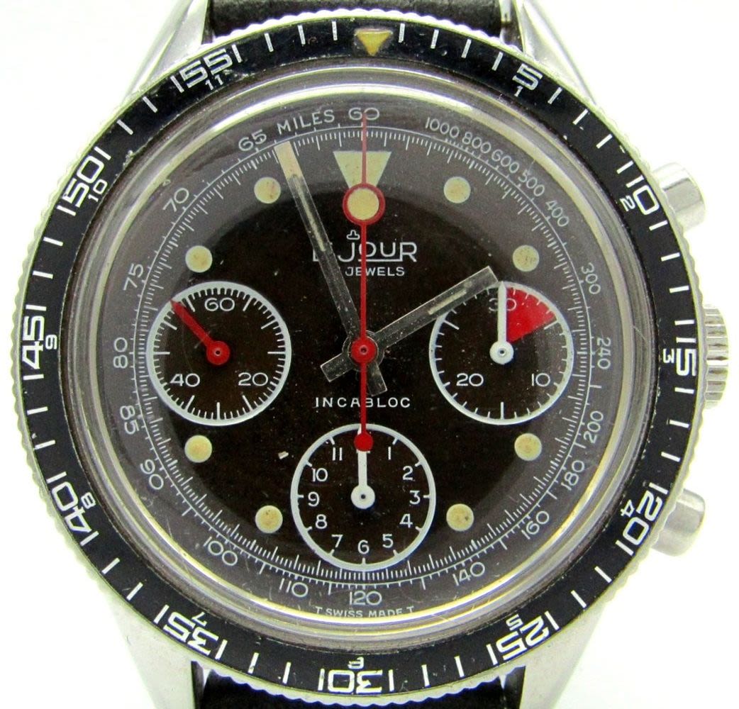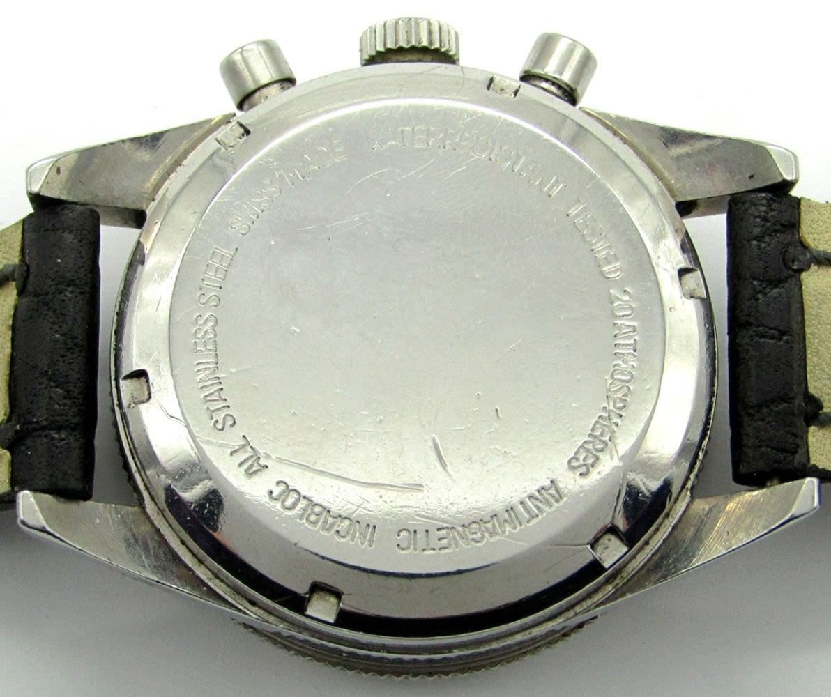 Original Tropical Color Change Dial, 39mm Case Diameter, 17 Jewel Movement (Valjoux 7736) Signed, 4.P.Pingouin Co., Stainless Steel Screwback Case with Rotating Black Bezel. New Strap, Nice!!