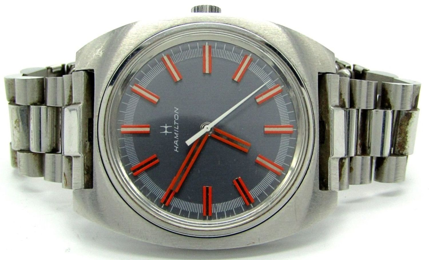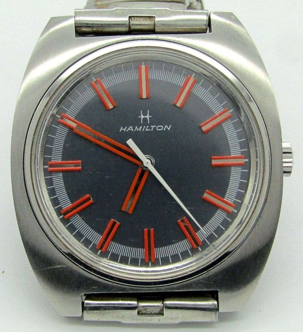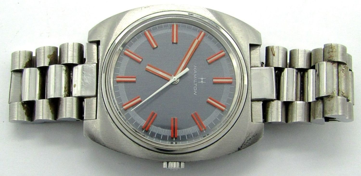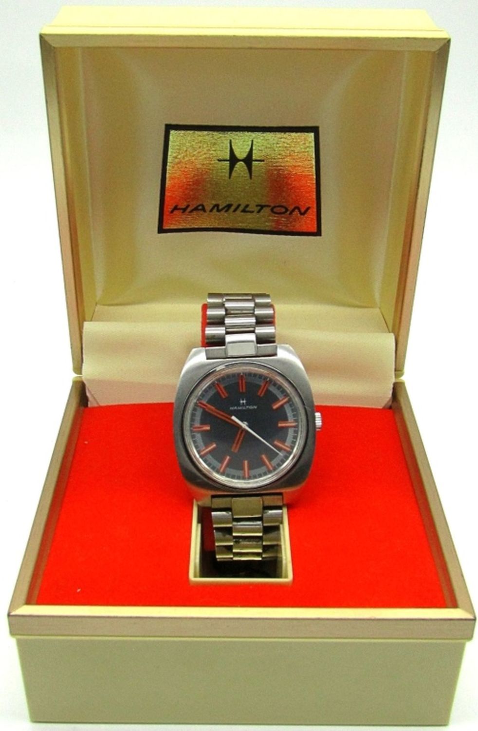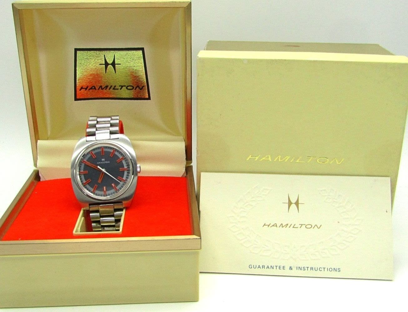 Original Mint Gray Dial with Red Markers, Screwback Stainless Case, 17 Jewel Movement, Circ 1975, 38mm, Complete with Boxes, Guarantee, Hang Tag.