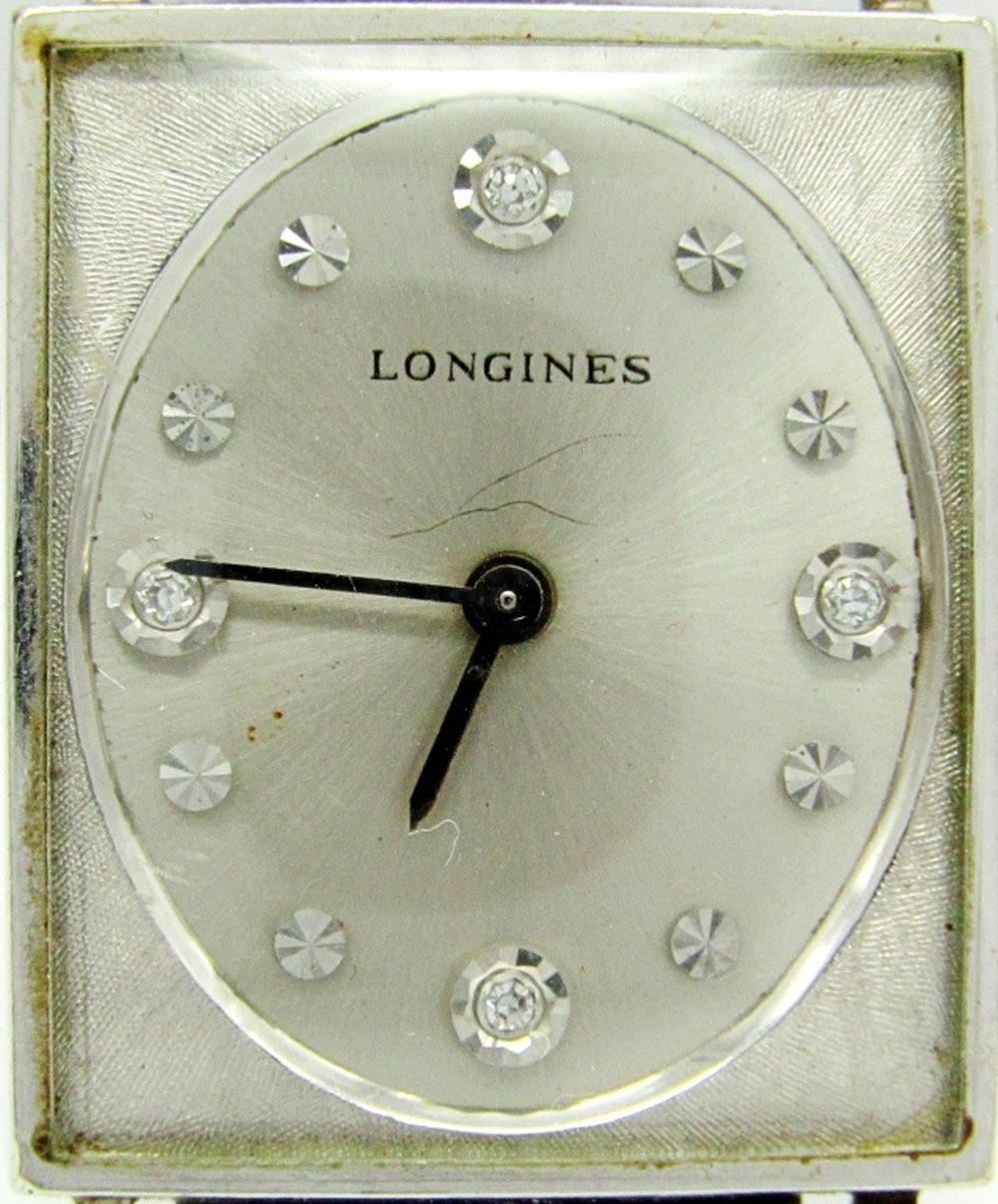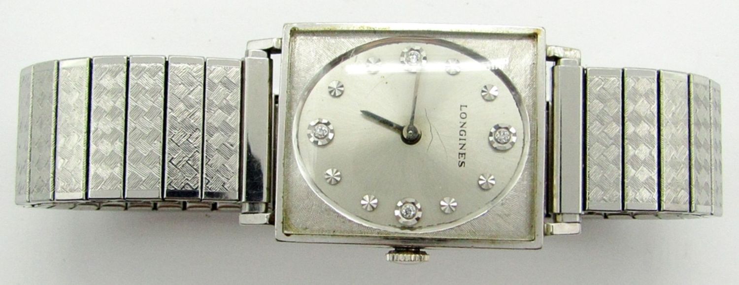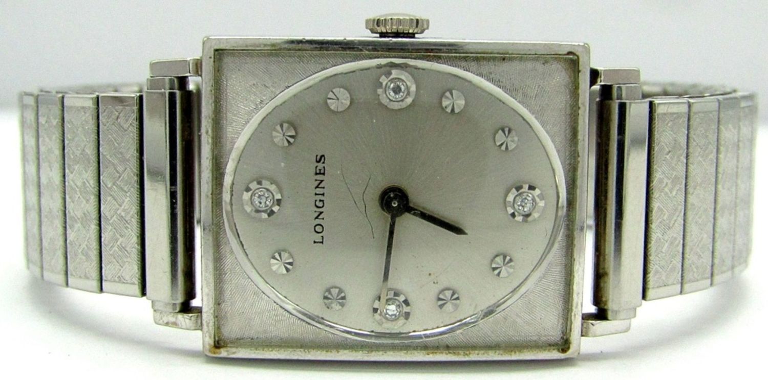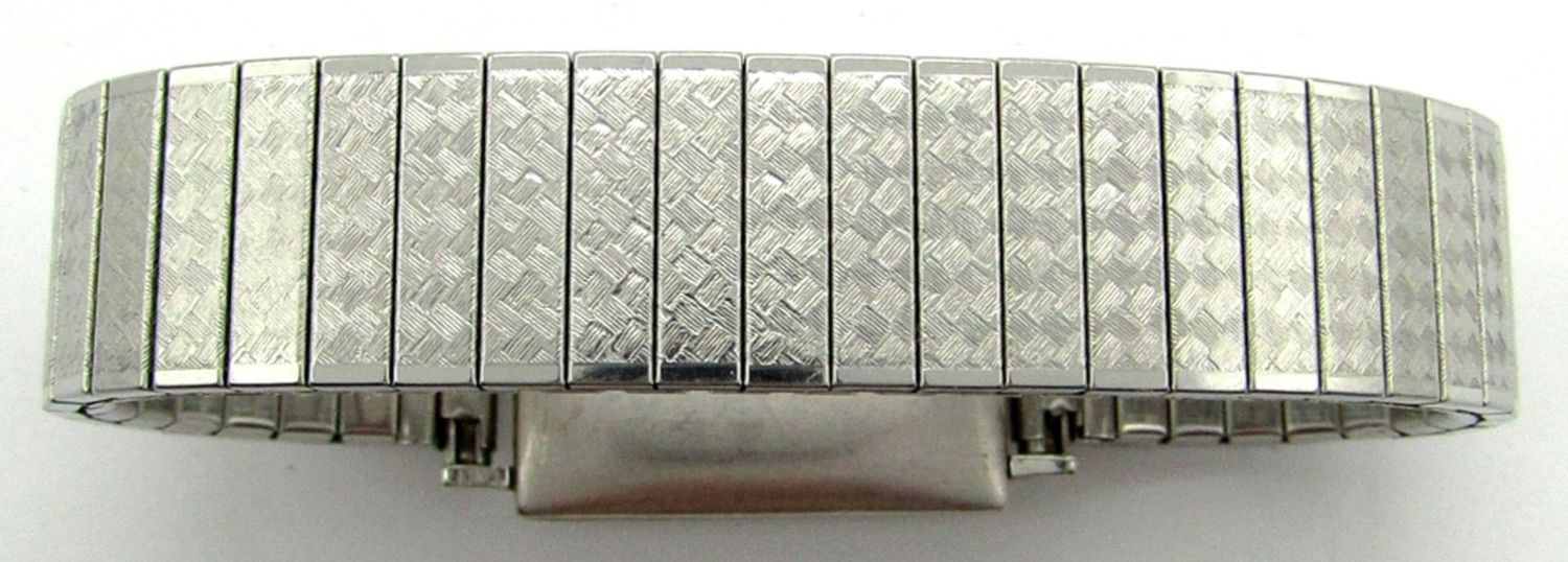 Original Dial with 4 Diamonds, White Gold Filled Rectangular Case, 36mm Long, 17 Jewel Cal.528 Movement. Speidel Stretch Band.